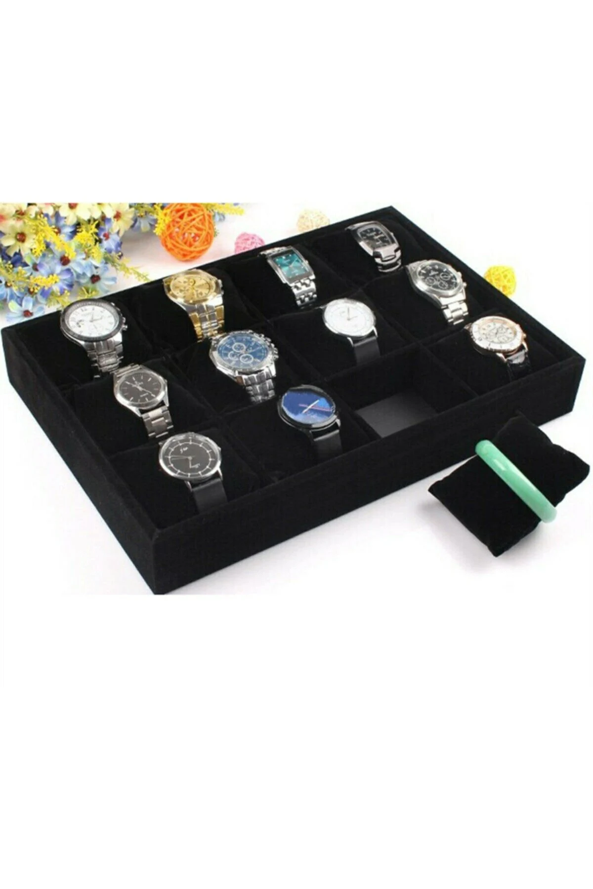 12 Li Saat & Kelepçe Yastıklı Masaüstü Kutu & Tabla Siyah Süet
