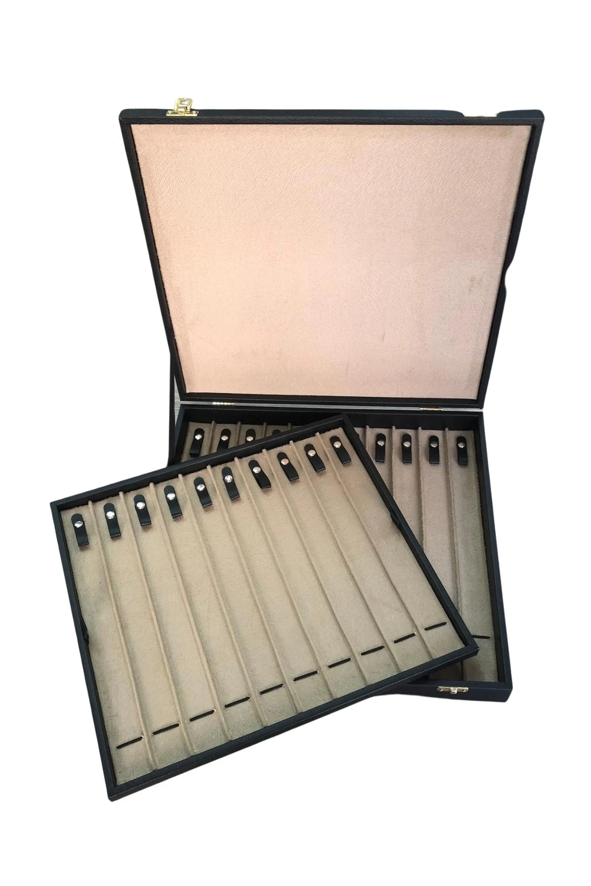 Camlı Kapaklı Çift Kat Tesbih&Bileklik ve takı Tablası Siyah deri/içi Beyaz (21 Kanallı ve Çıtçıtlı)