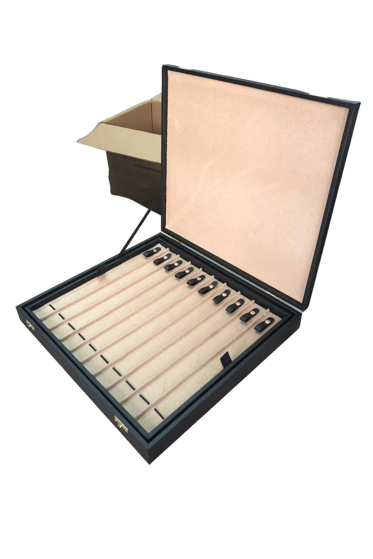 Saat& Yüzük&Tesbih ve Zincir Çantası 16 Lİ Ahşap Kasa Üzeri Siyah Deri Kaplama
