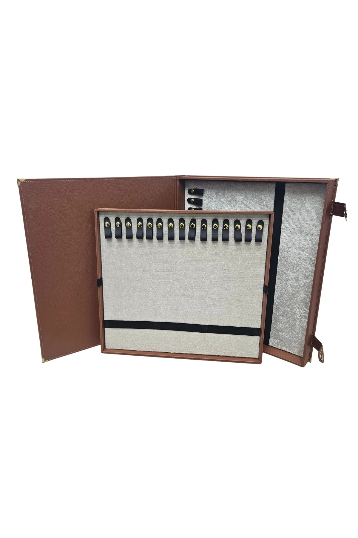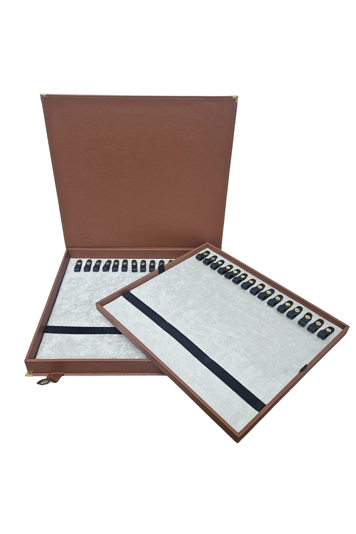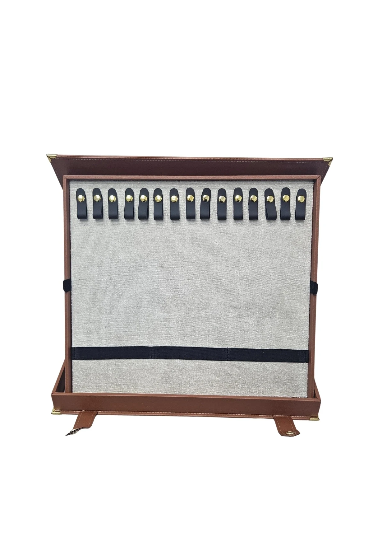 Deri malzeme kullanımı sayesinde dayanıklı ve uzun ömürlü bir kullanım sunar 30 adet tesbih kapasitesiyle, günlük kullanım için ideal bir saklama çözümüdür 34,5 x 38,5 x4 cm boyutlarındaki kompakt tasarımı, dolap içinde kolayca yer bulmasını sağlar