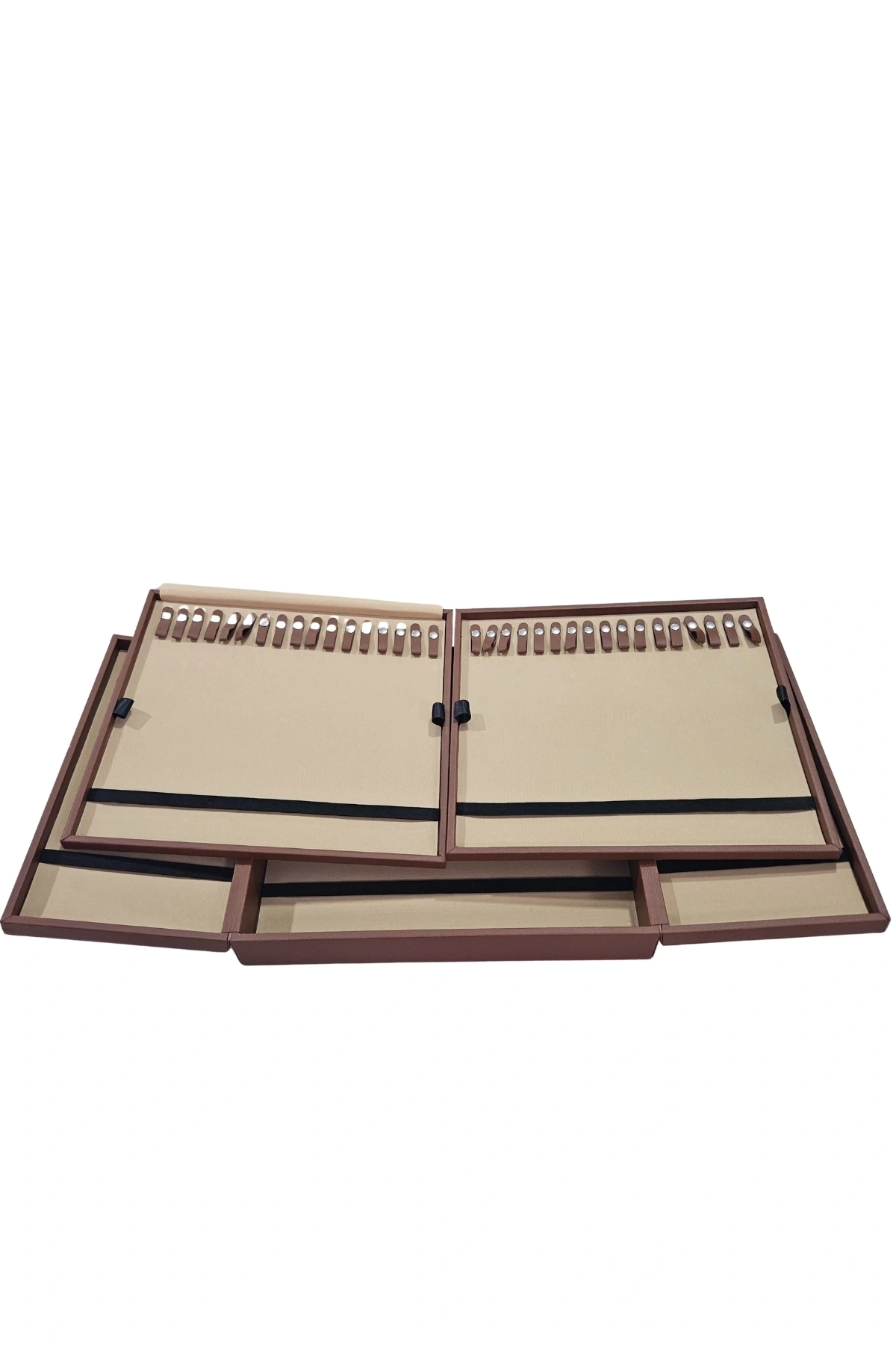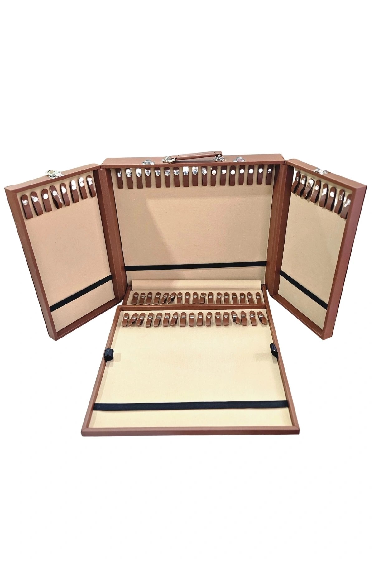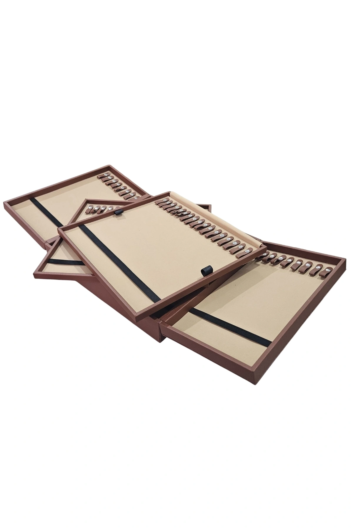 Ahşap malzeme kullanımı sayesinde dayanıklı ve uzun ömürlü bir kullanım sunar Siyah deri kulup detayları ile şık ve modern bir görünüm kazandırır 3 ad tablada 17 şer adet * 2 ad yan bölümde 8 er adet çıtçıt bulunur.