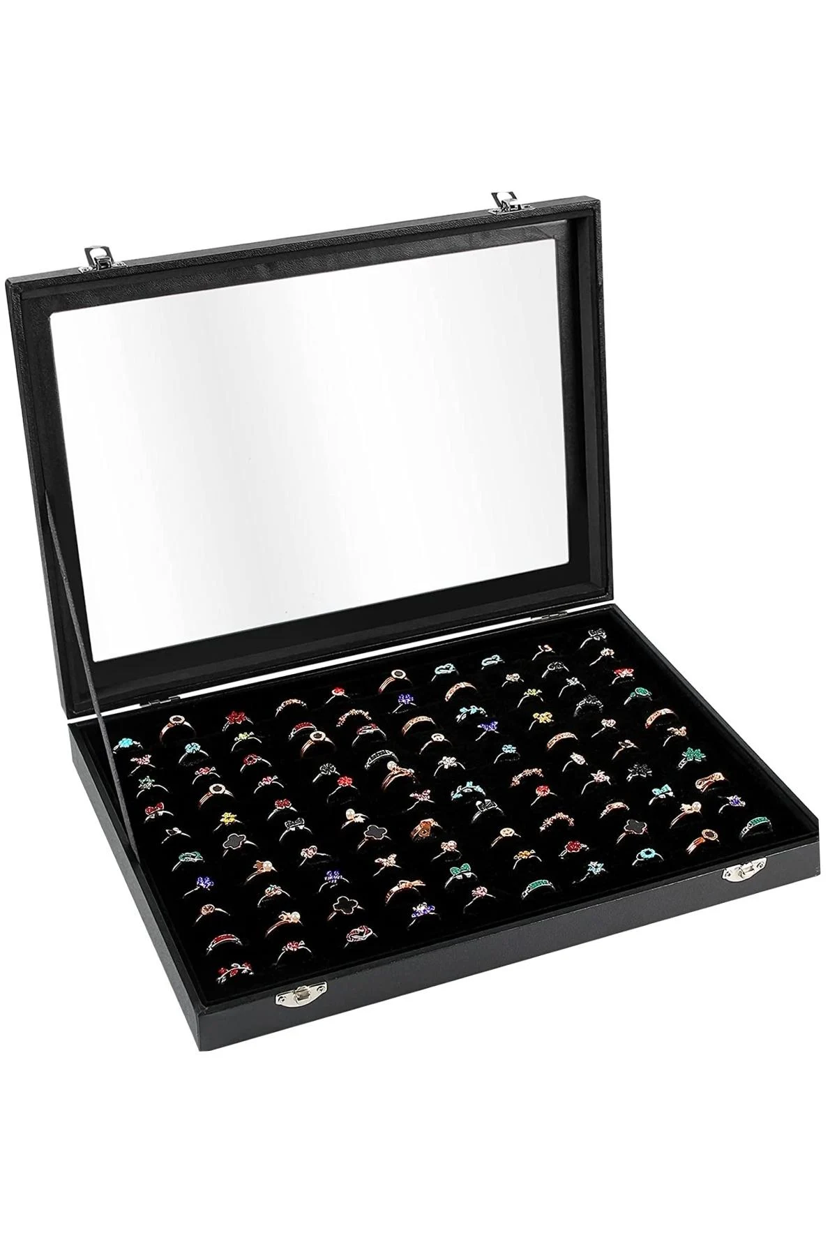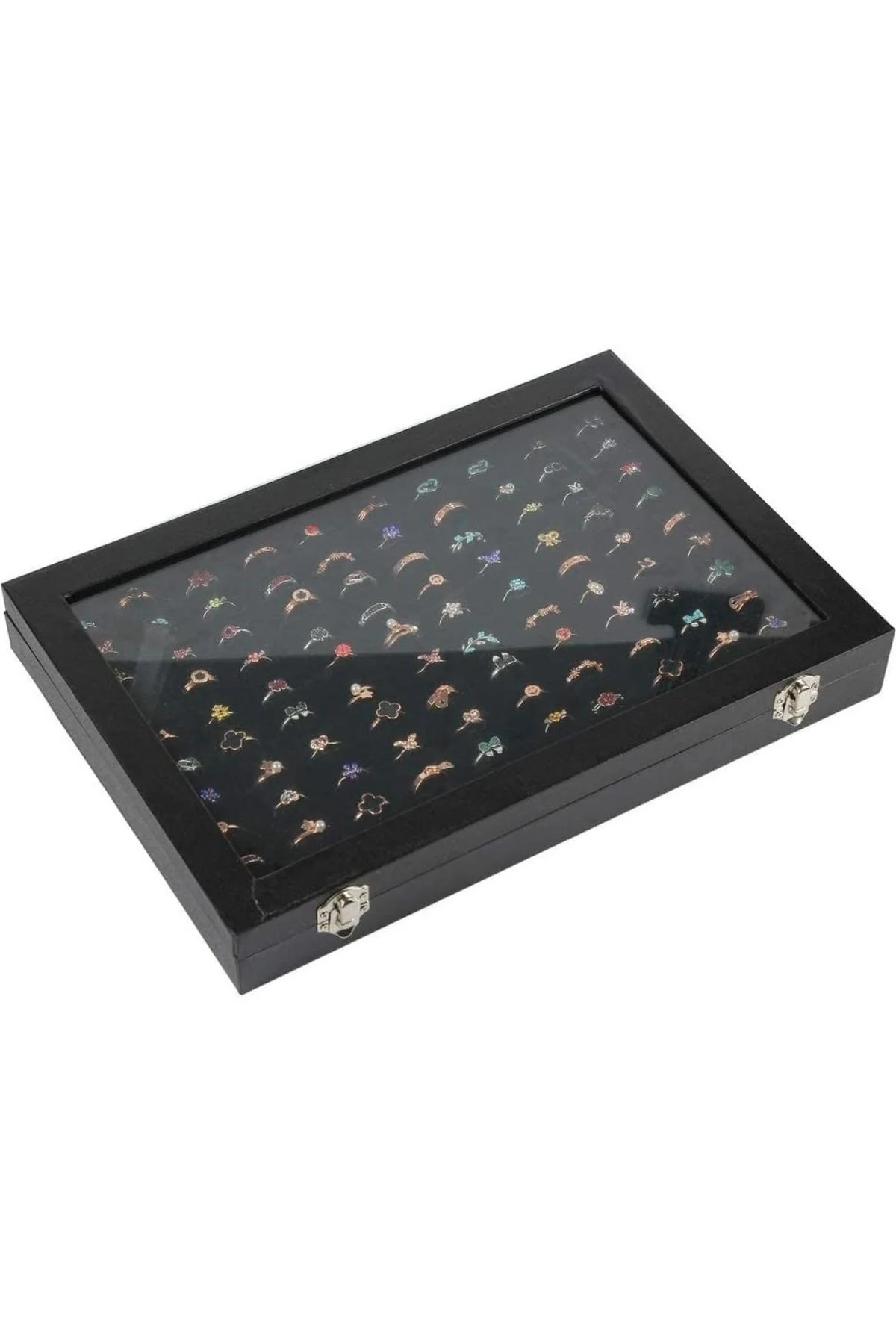 Camlı Kapaklı Batırlmalı 100 lü Yüzük Tablası Siyah Süet