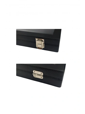 Camlı Kapaklı 8 bölmeli Gözlük Kutusu,Takı Kutusu ve çantası Siyah /beyaz içi deri