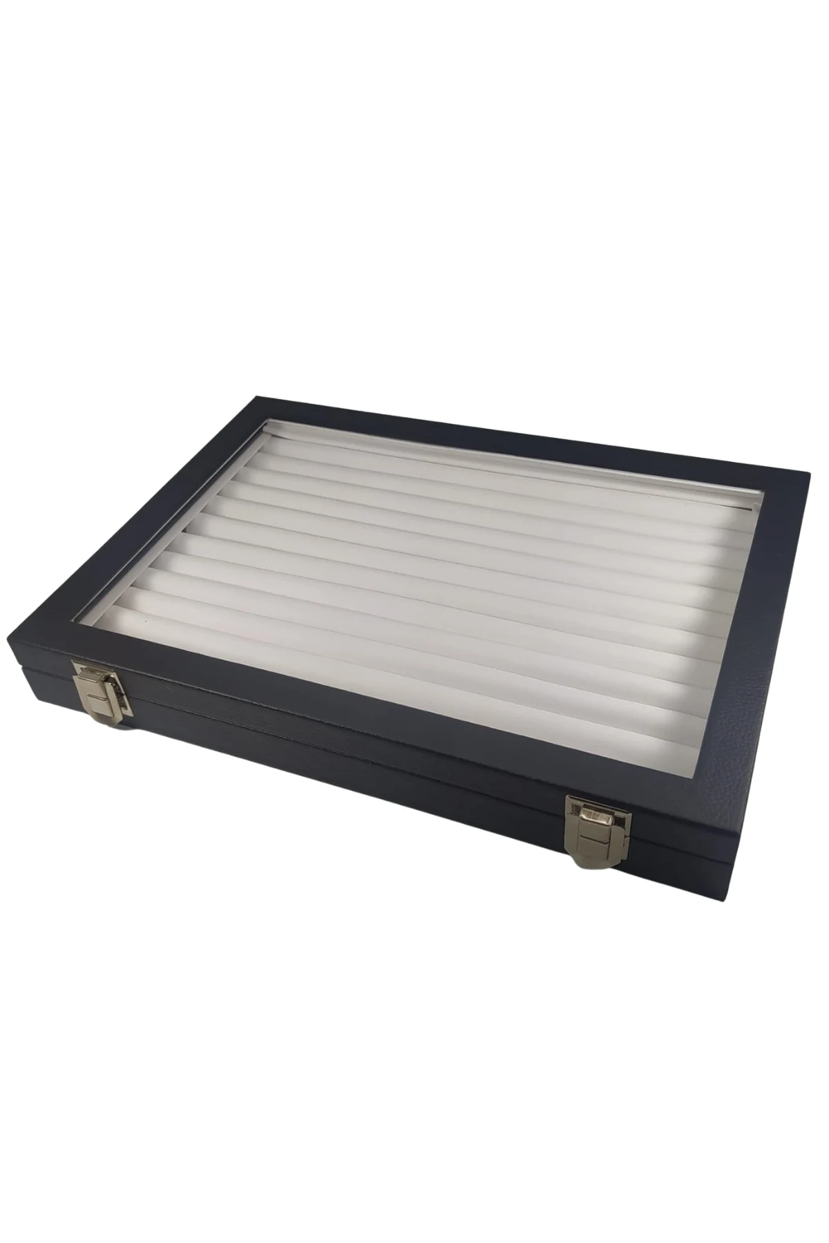 Camlı Kapaklı 20 Bölmeli Takı Tablası Siyah /siyah içi deri