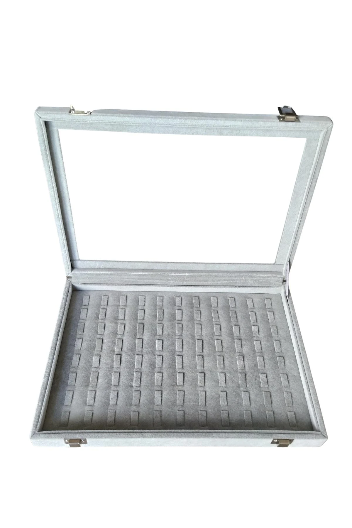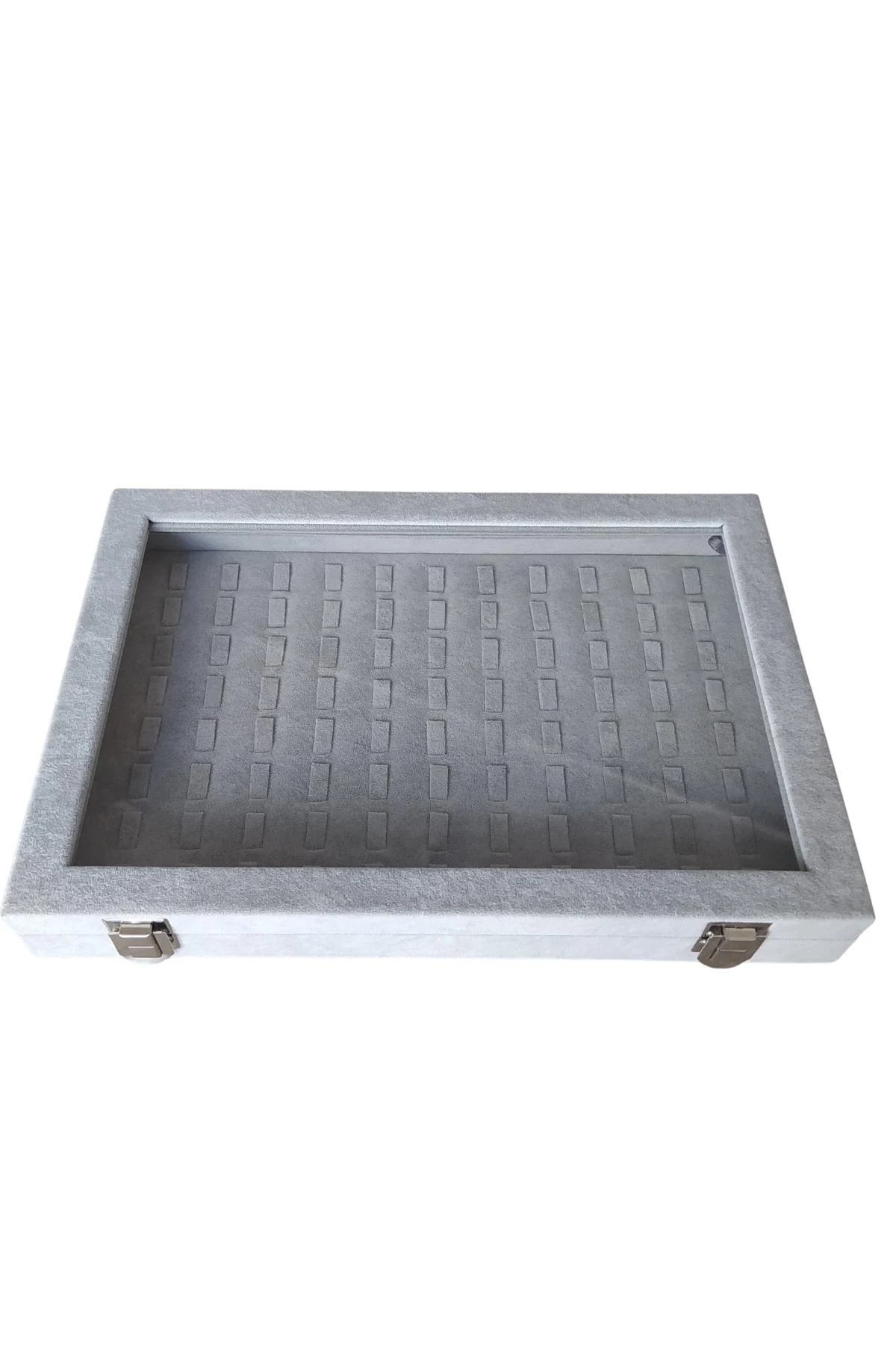 Camlı Kapaklı Batırlmalı 100 lü Yüzük Tablası Gri Süet
