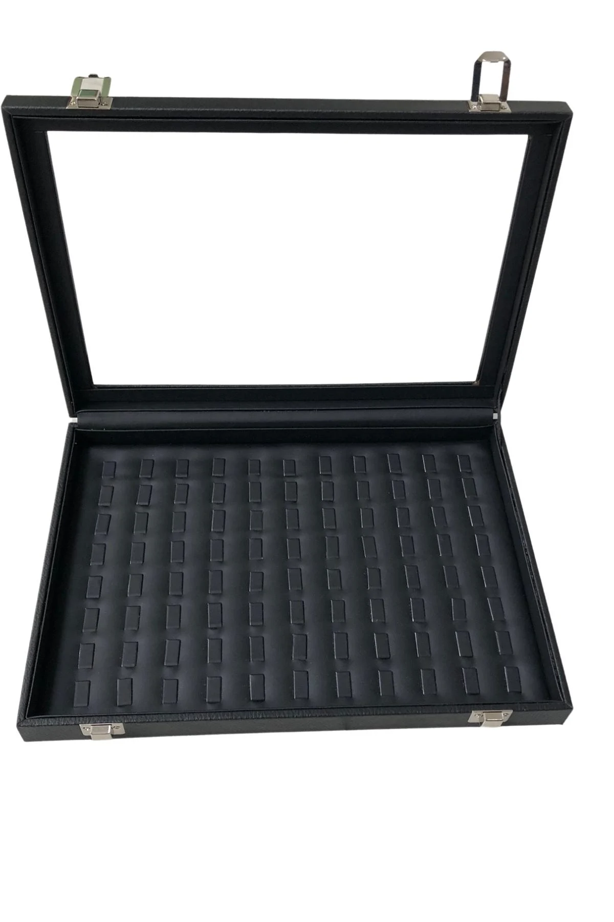Camlı Kapaklı Tırnaklı Yuzuk-Takı Tablası Siyah Deri / İçi Siyah ( 88 Tırnaklı)
