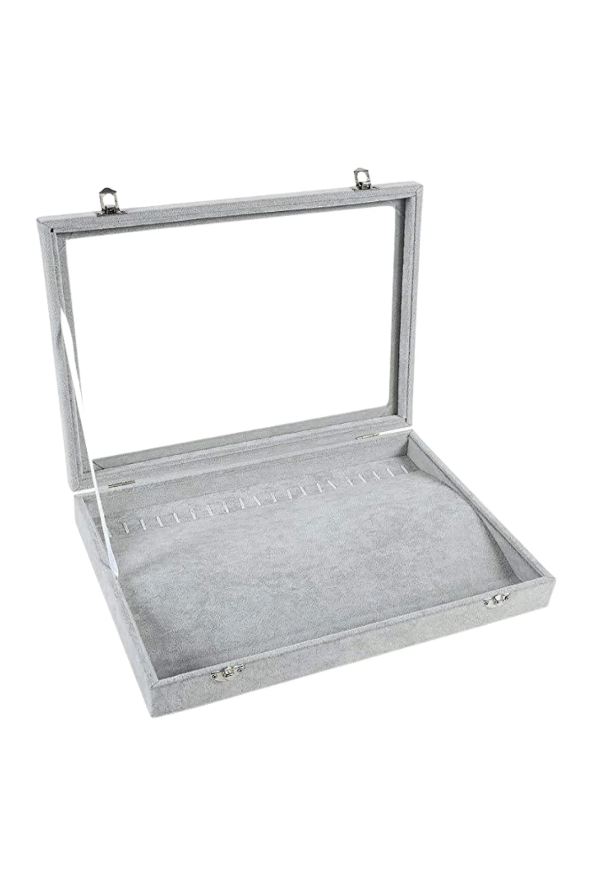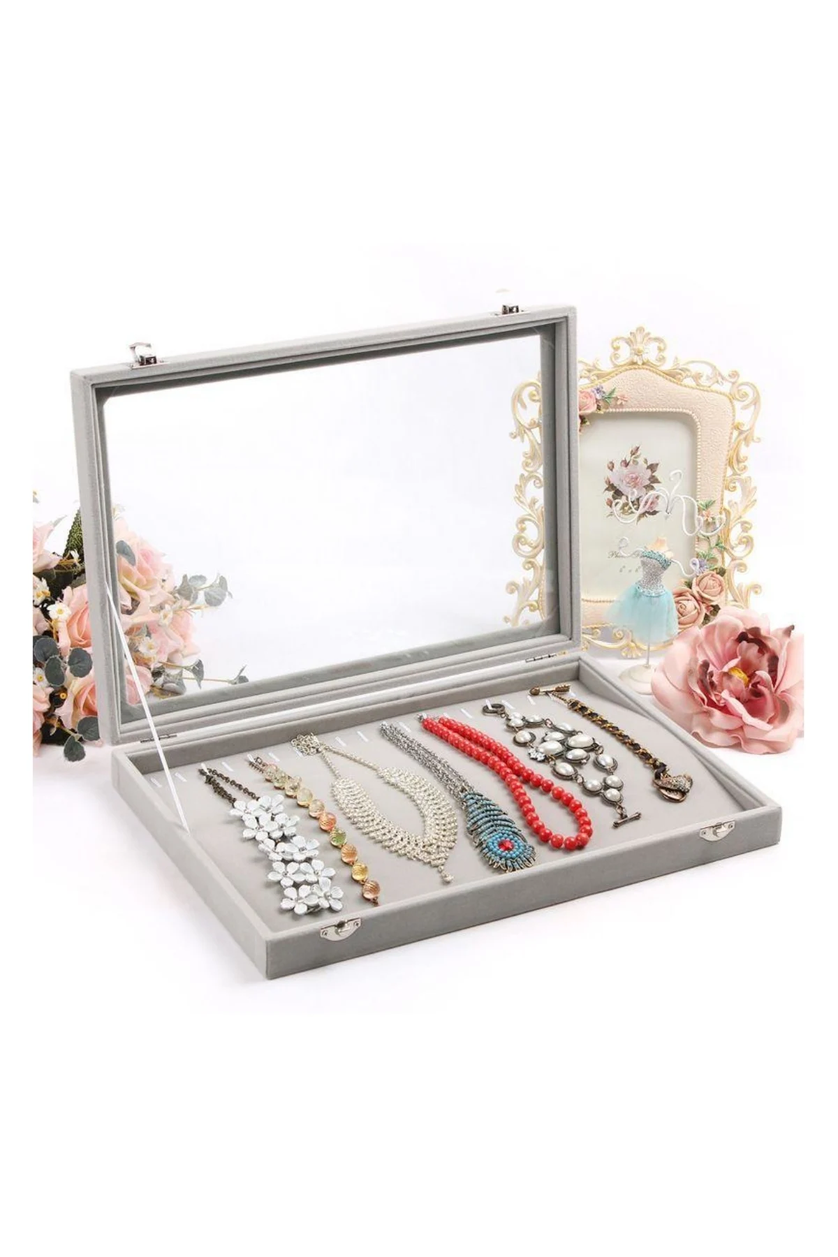 Üstü camlı etrafı süet kaplamadır. İçerisinde bir çok takınızı sergileyebilrsiniz . içerisinde takı ları tuturabilmeniz için 20 ad çentik bulunur. ebatları 24x35x 5 cm dir .