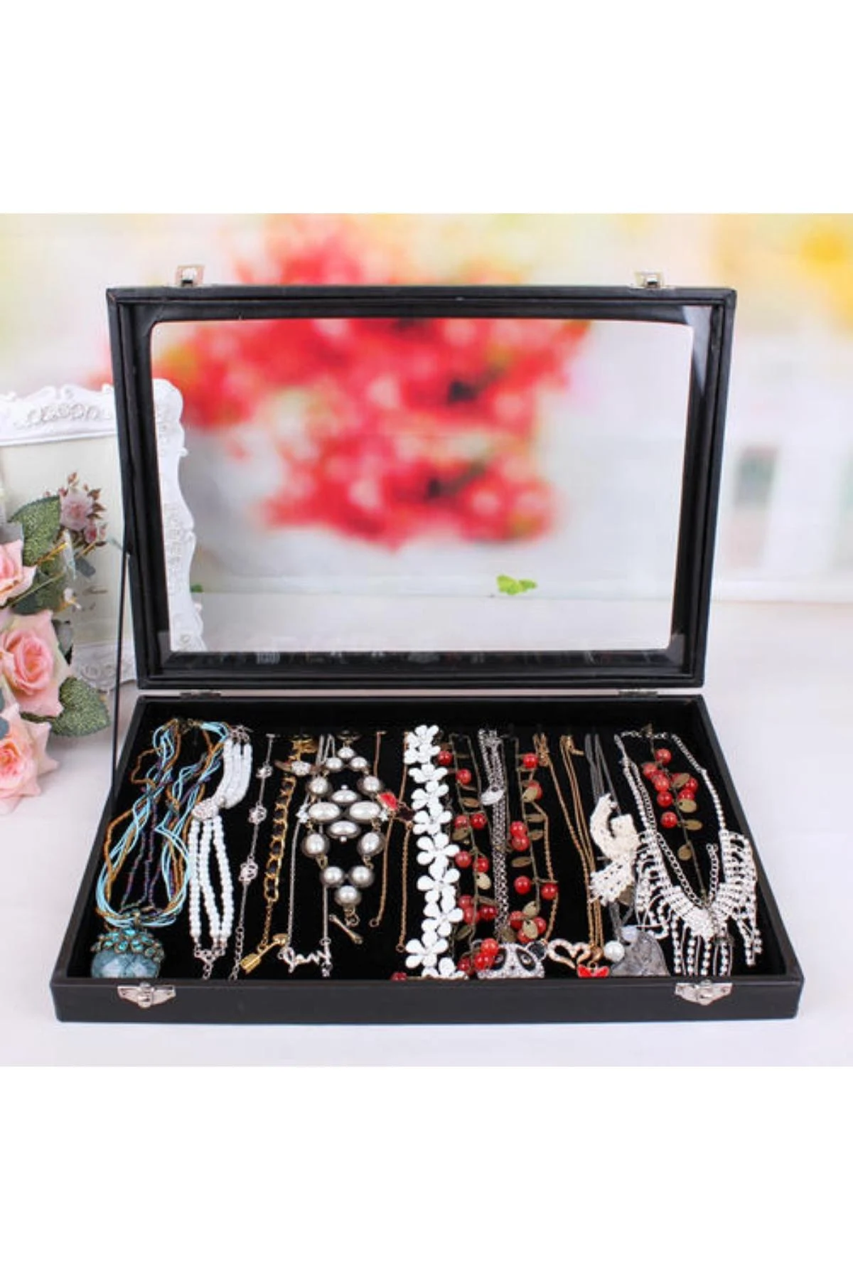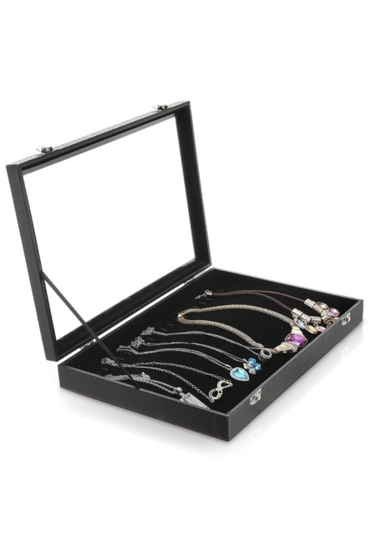 Camlı Kapaklı Zincir & Bileklik Takı Tablası Siyah içi Süet