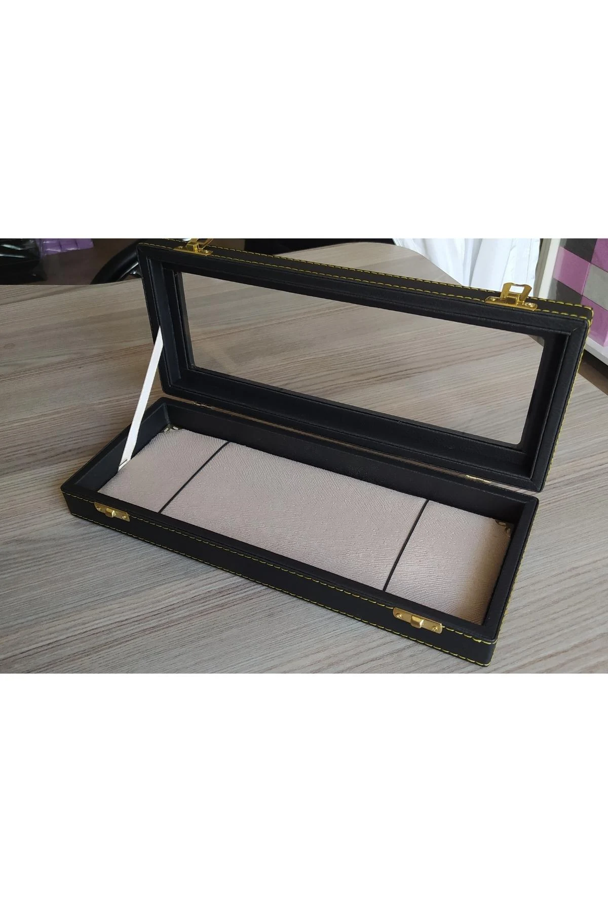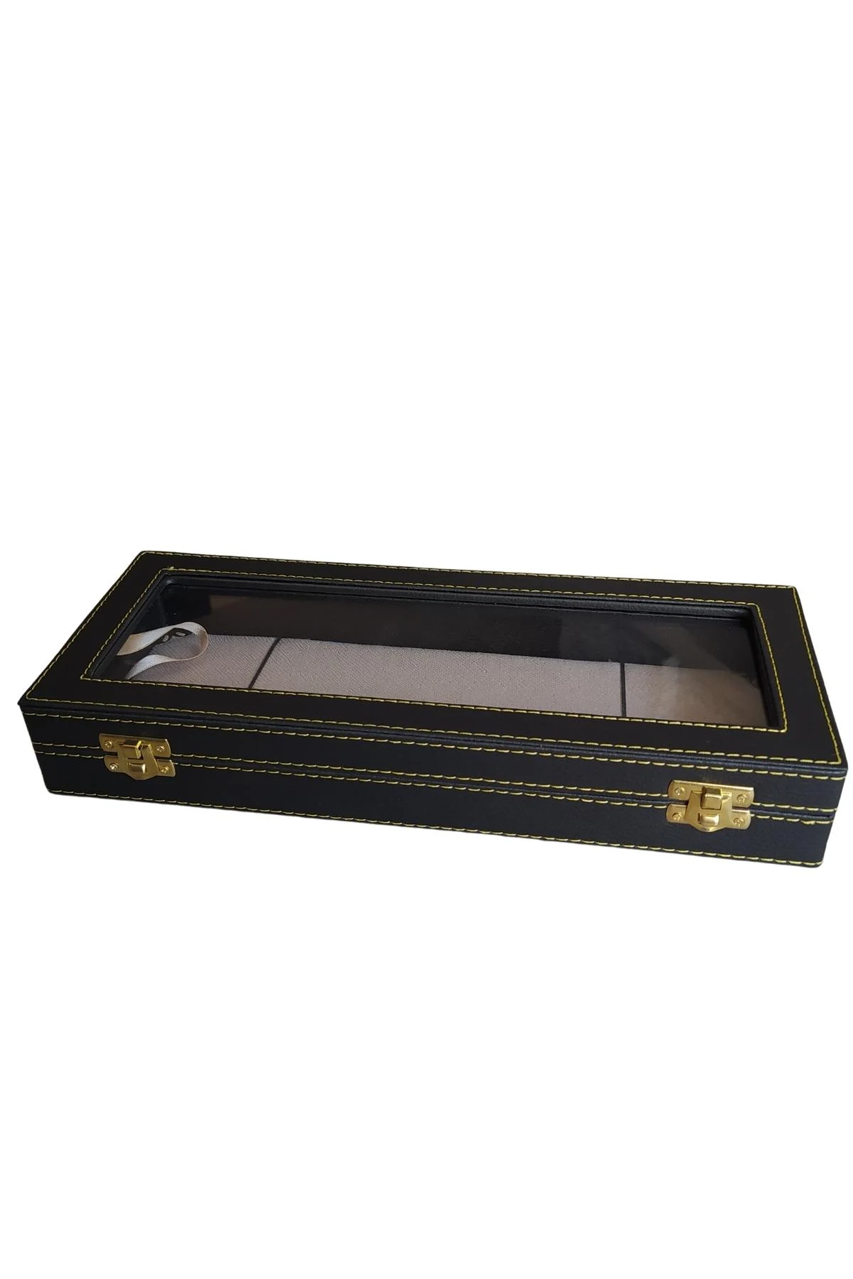 Deri Dikişli Ultra Geniş Camlı Tesbih& Bileklik Kutusu Siyah