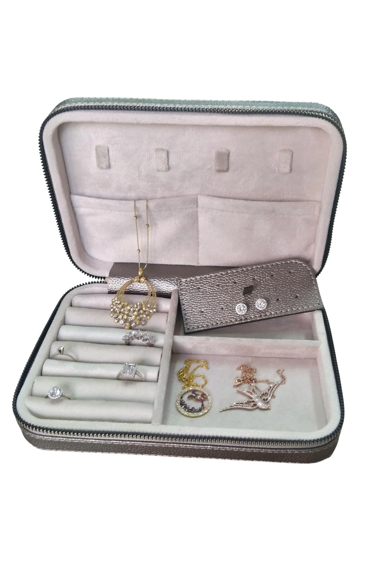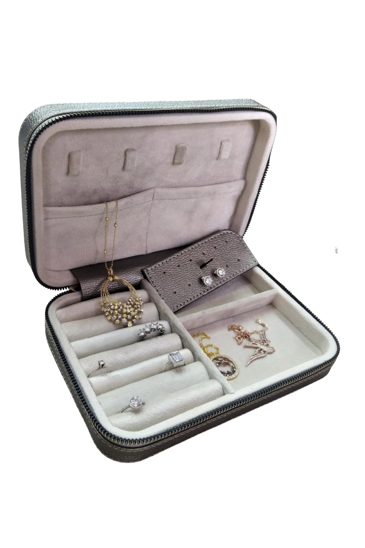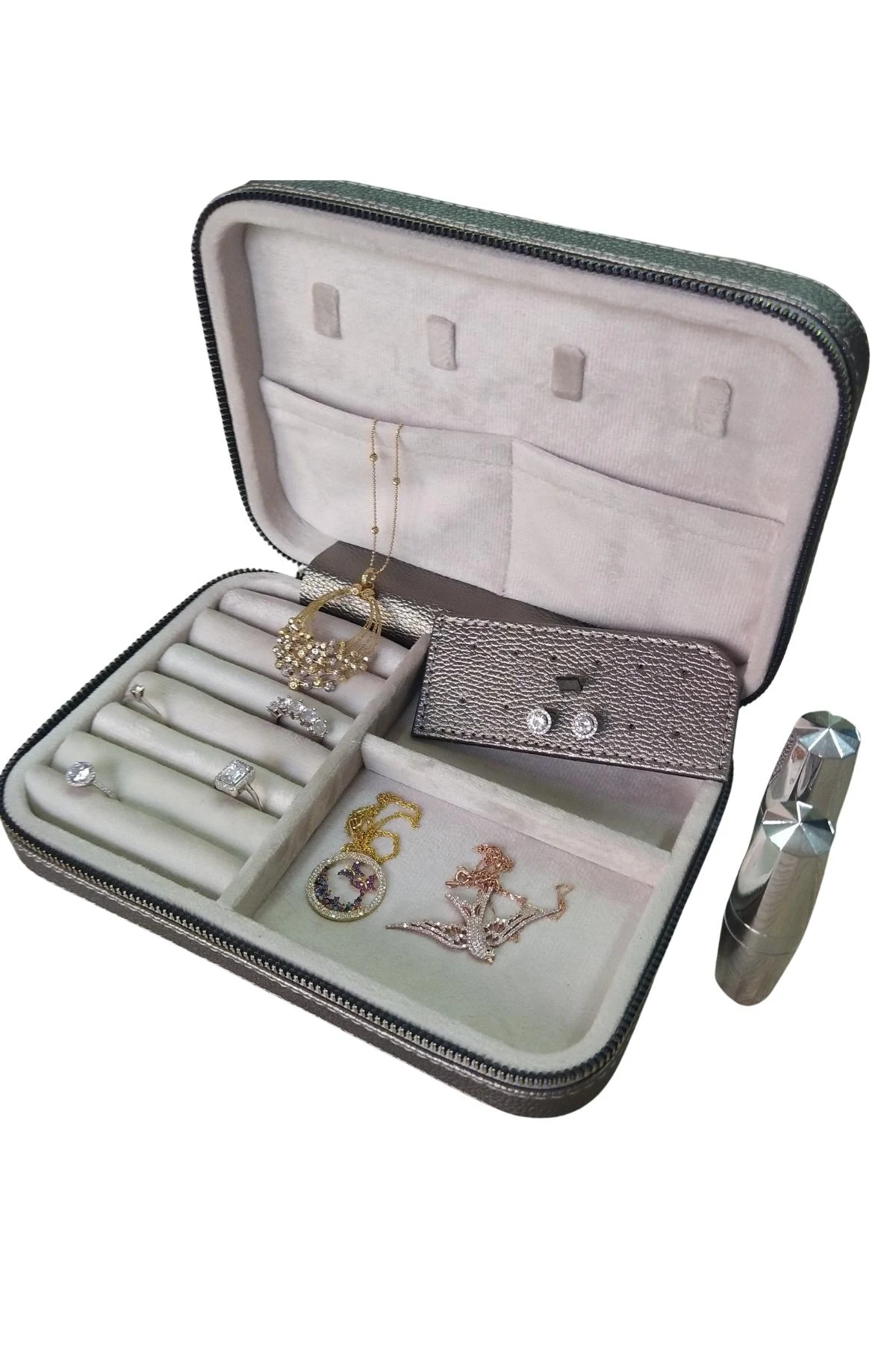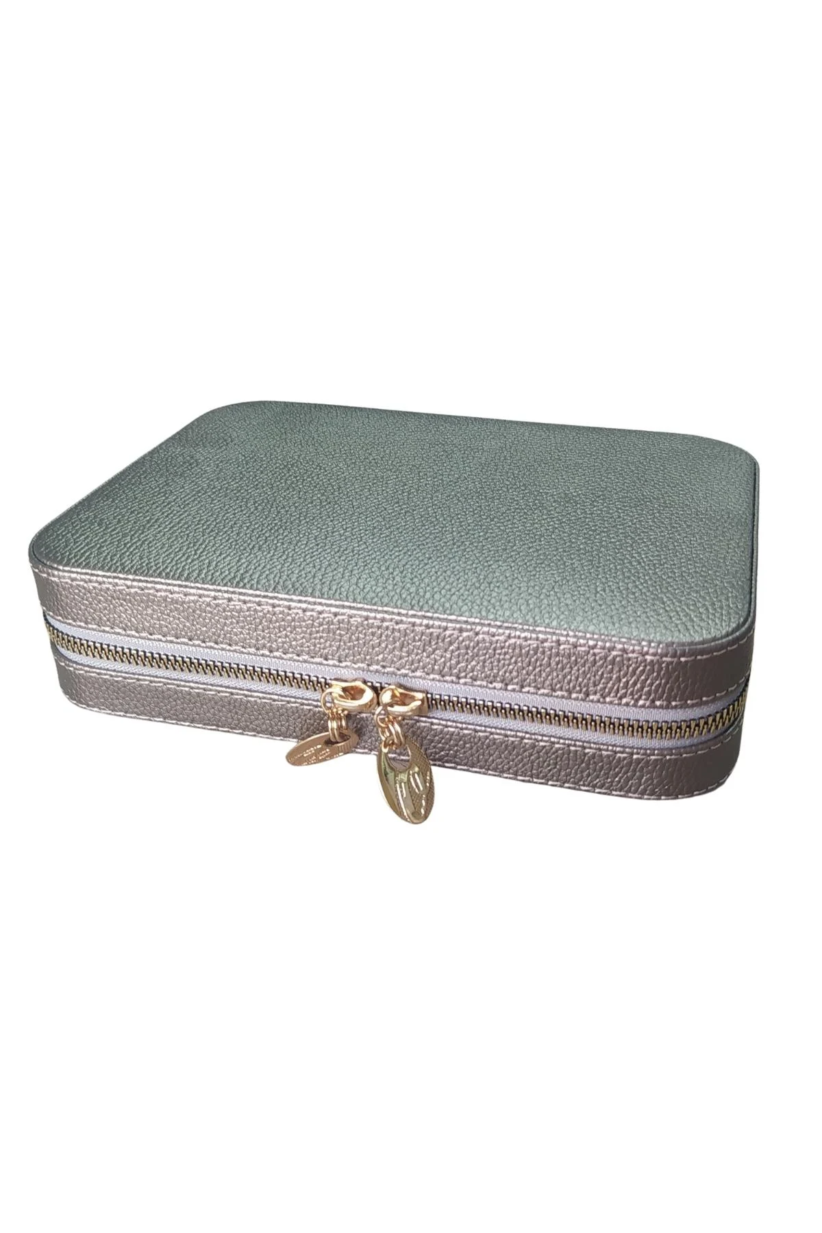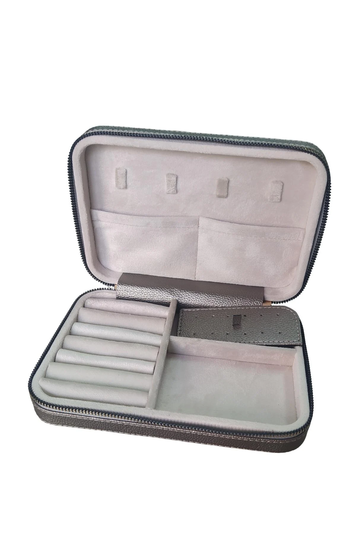 Fermuarlı Deri (Ahşap Kasalı ) Büyük boy Takı, Seyahat Ve Mücevher Çantası,Antrasit(14x21 Cm)