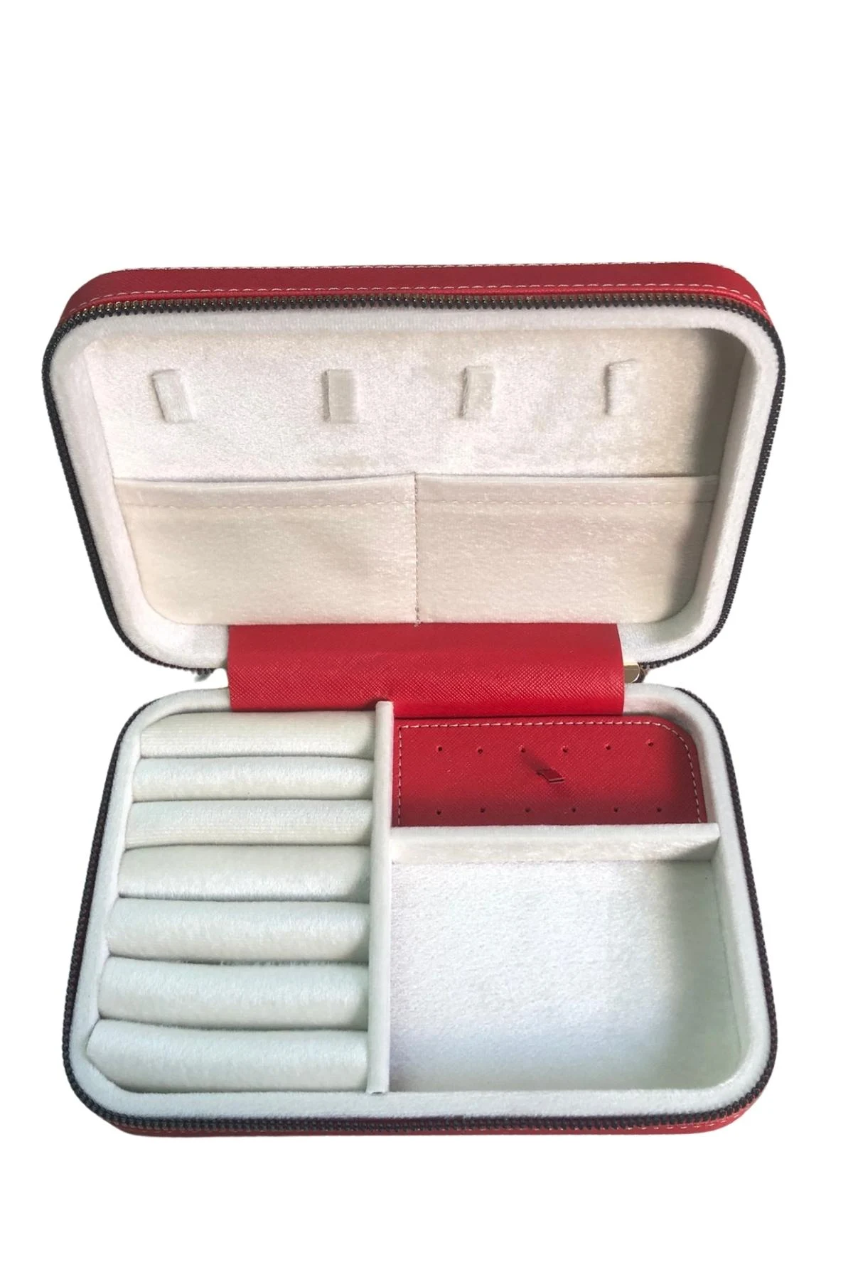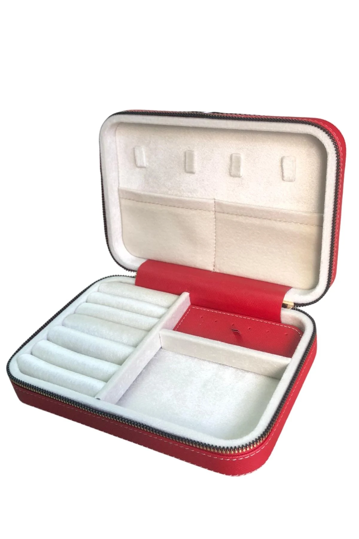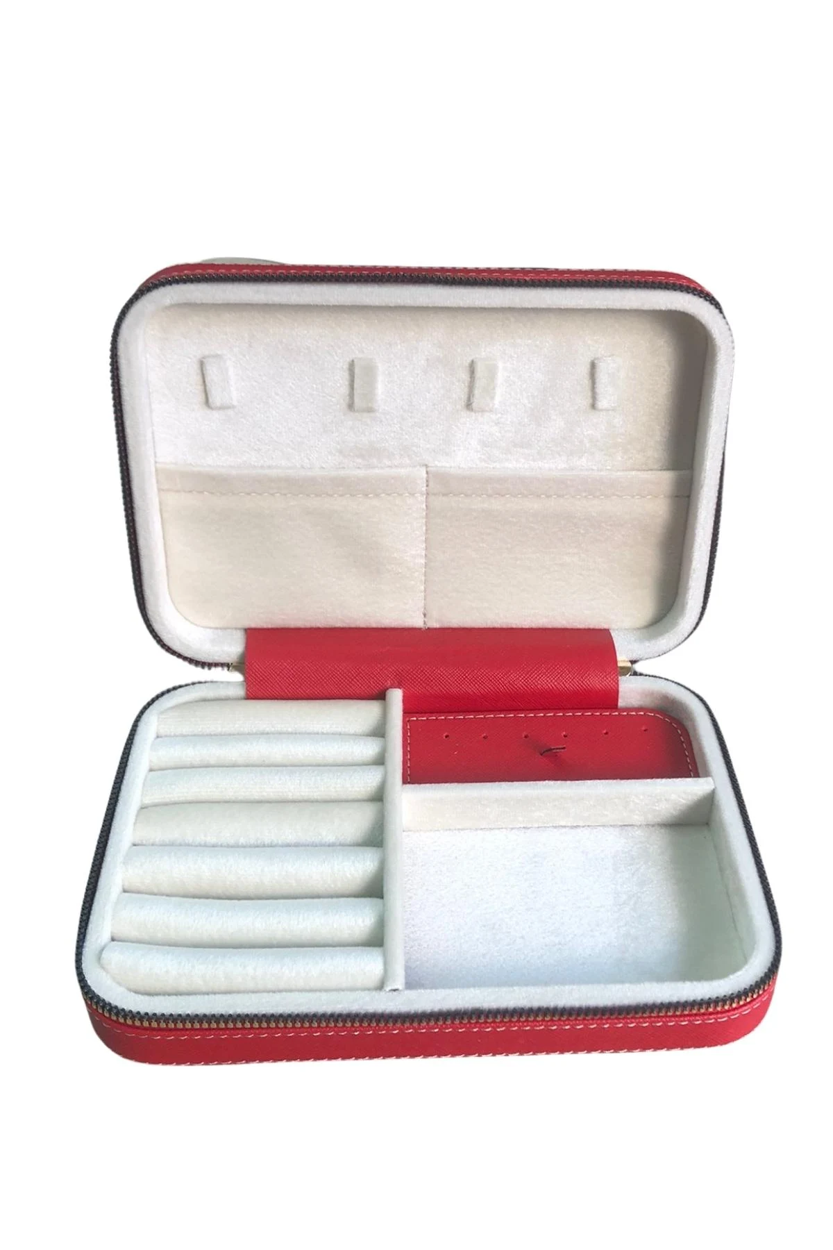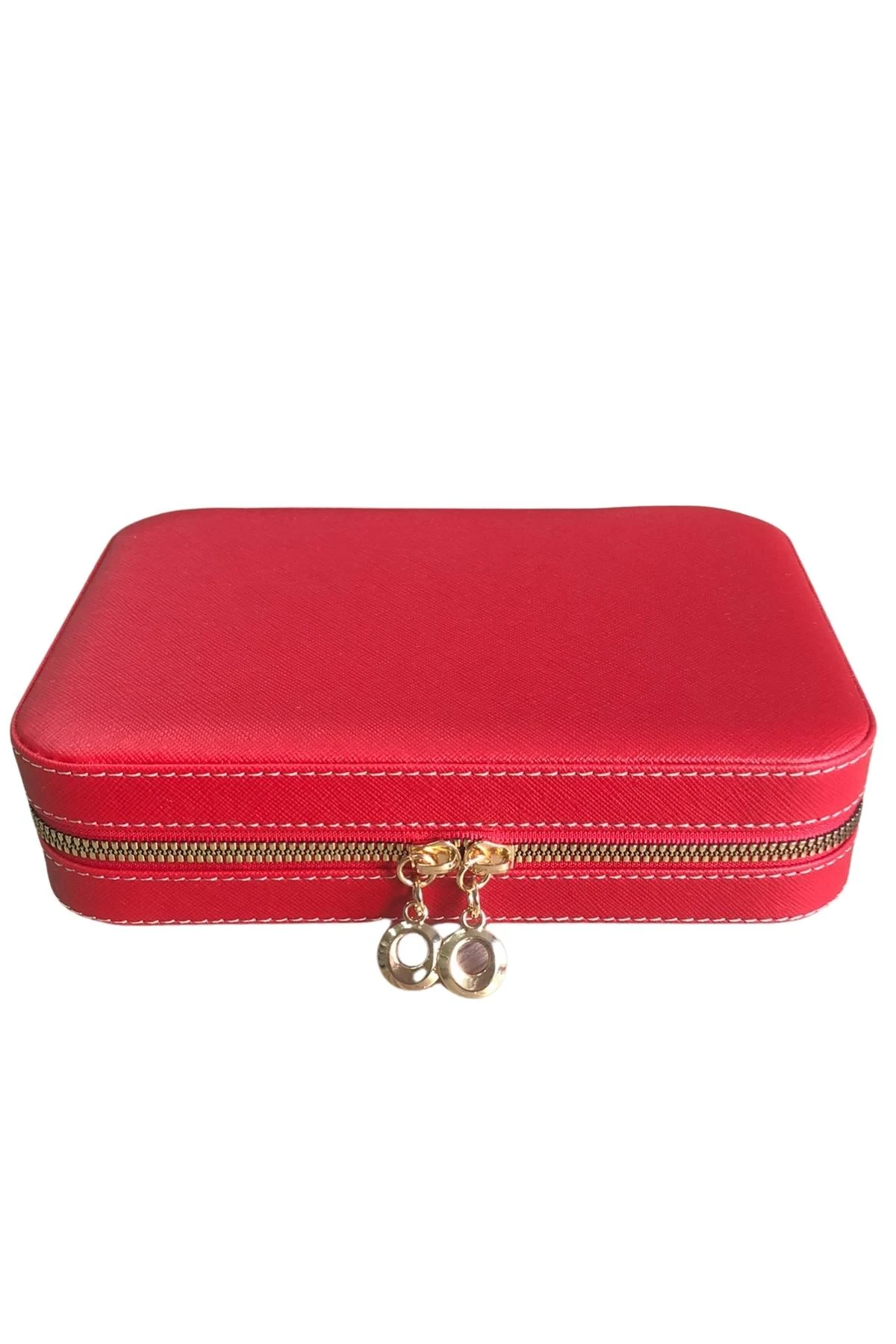 Fermuarlı Deri (Ahşap Kasalı ) Büyük boy Takı, Seyahat Ve Mücevher Çantası,kutusu Kırmızı (14x21)