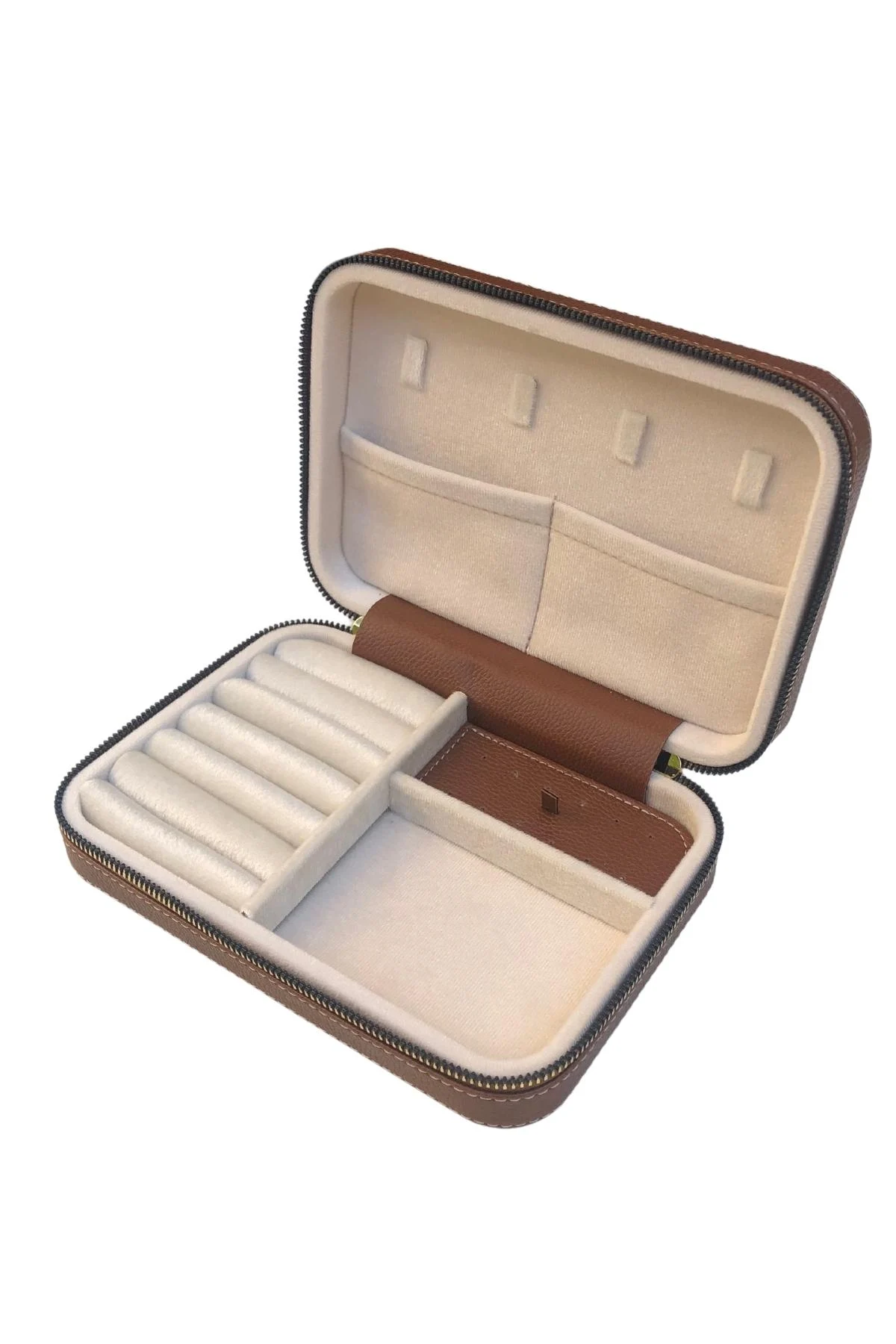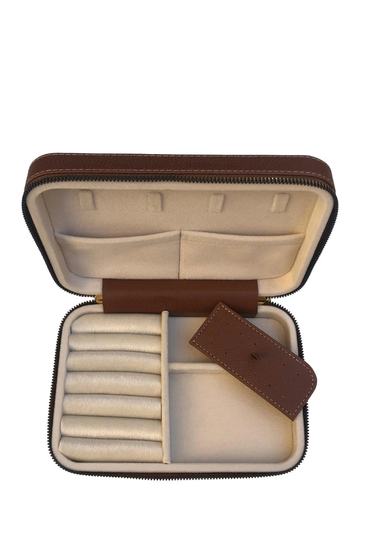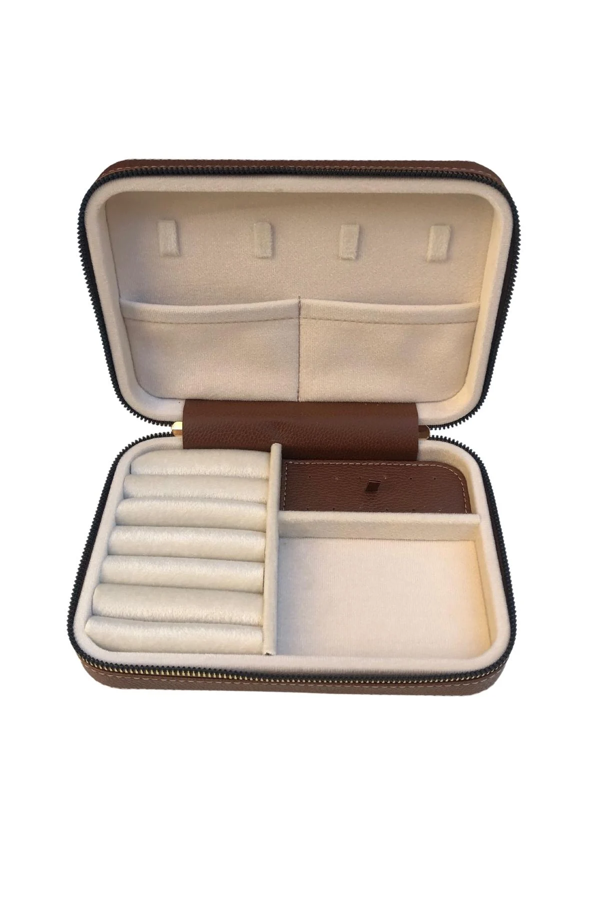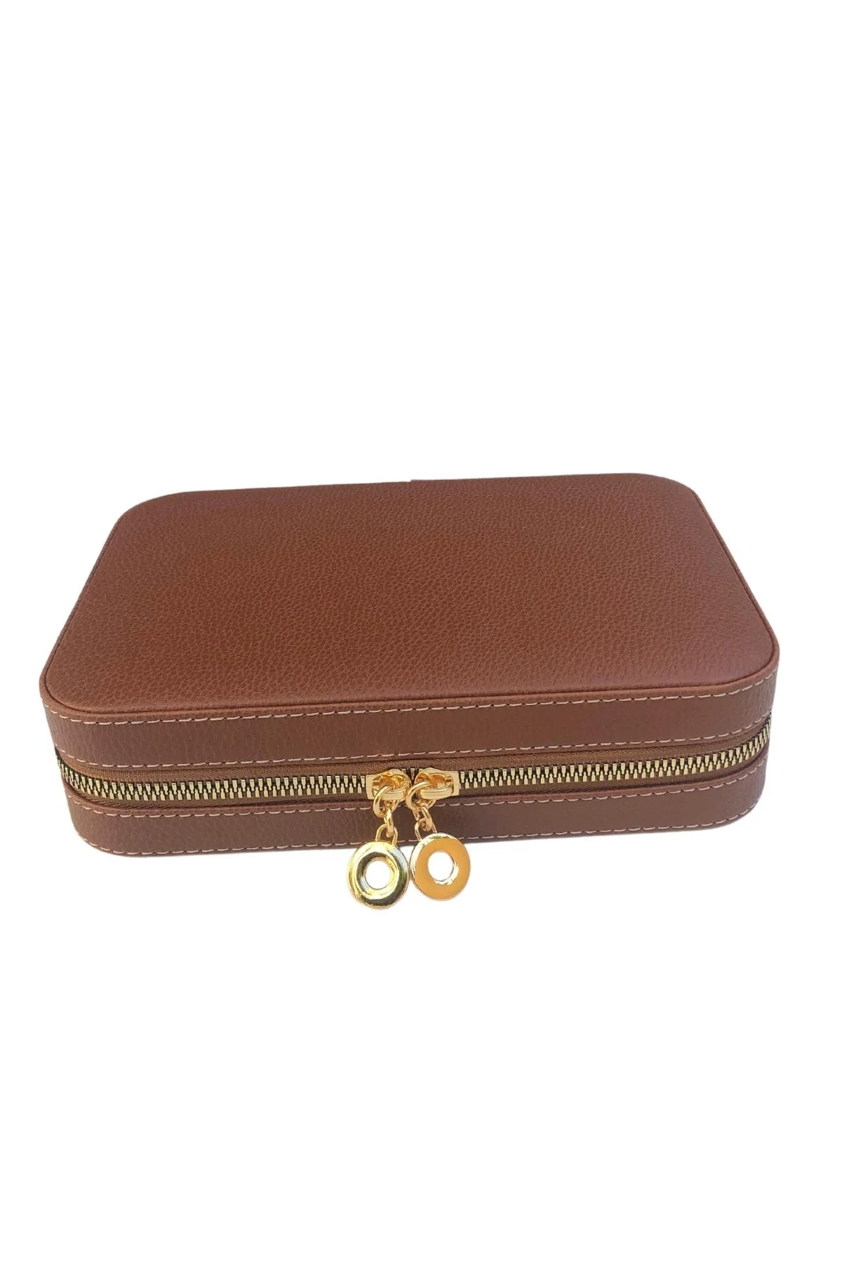 Fermuarlı Deri (Ahşap Kasalı ) Büyük boy Takı, Seyahat Ve Mücevher Çantası,kutusu Taba (14x21 Cm)