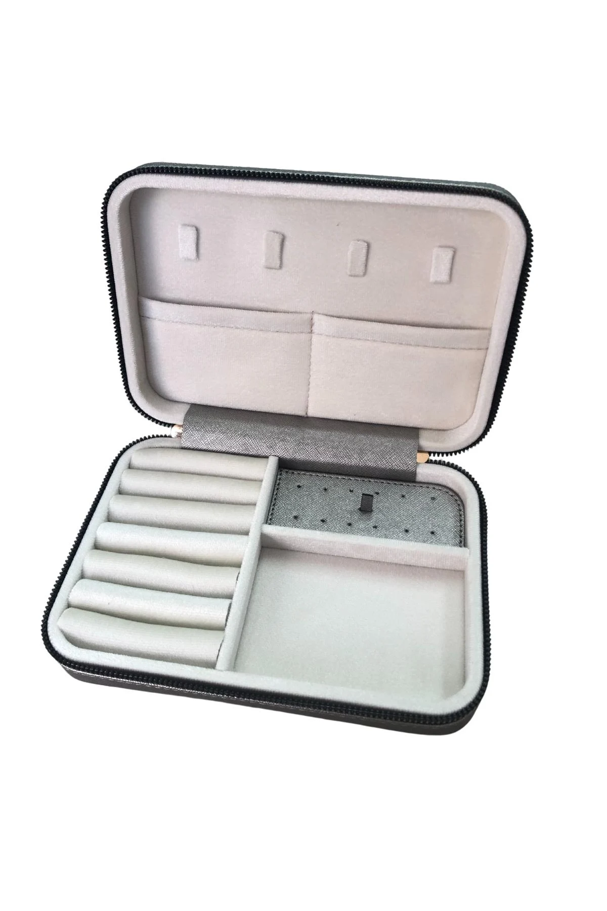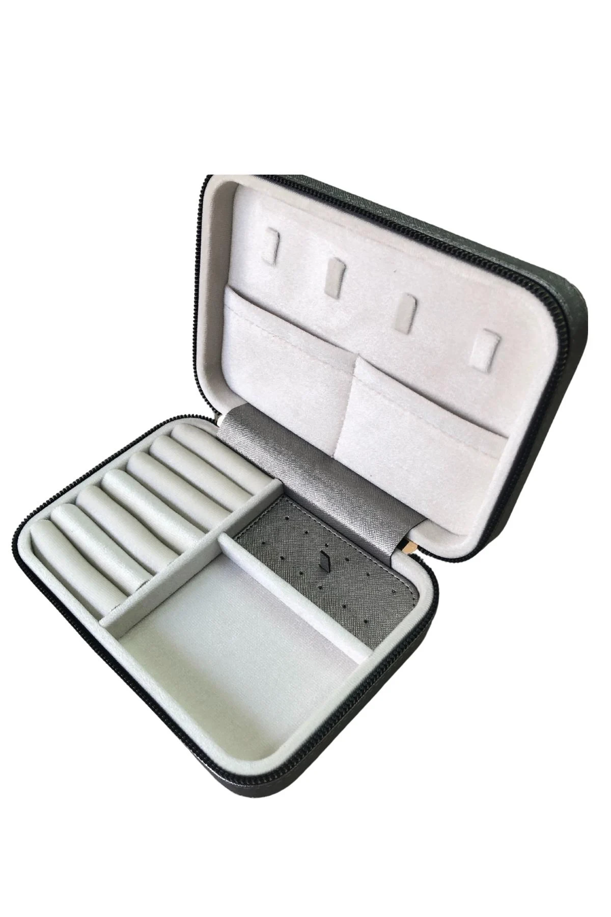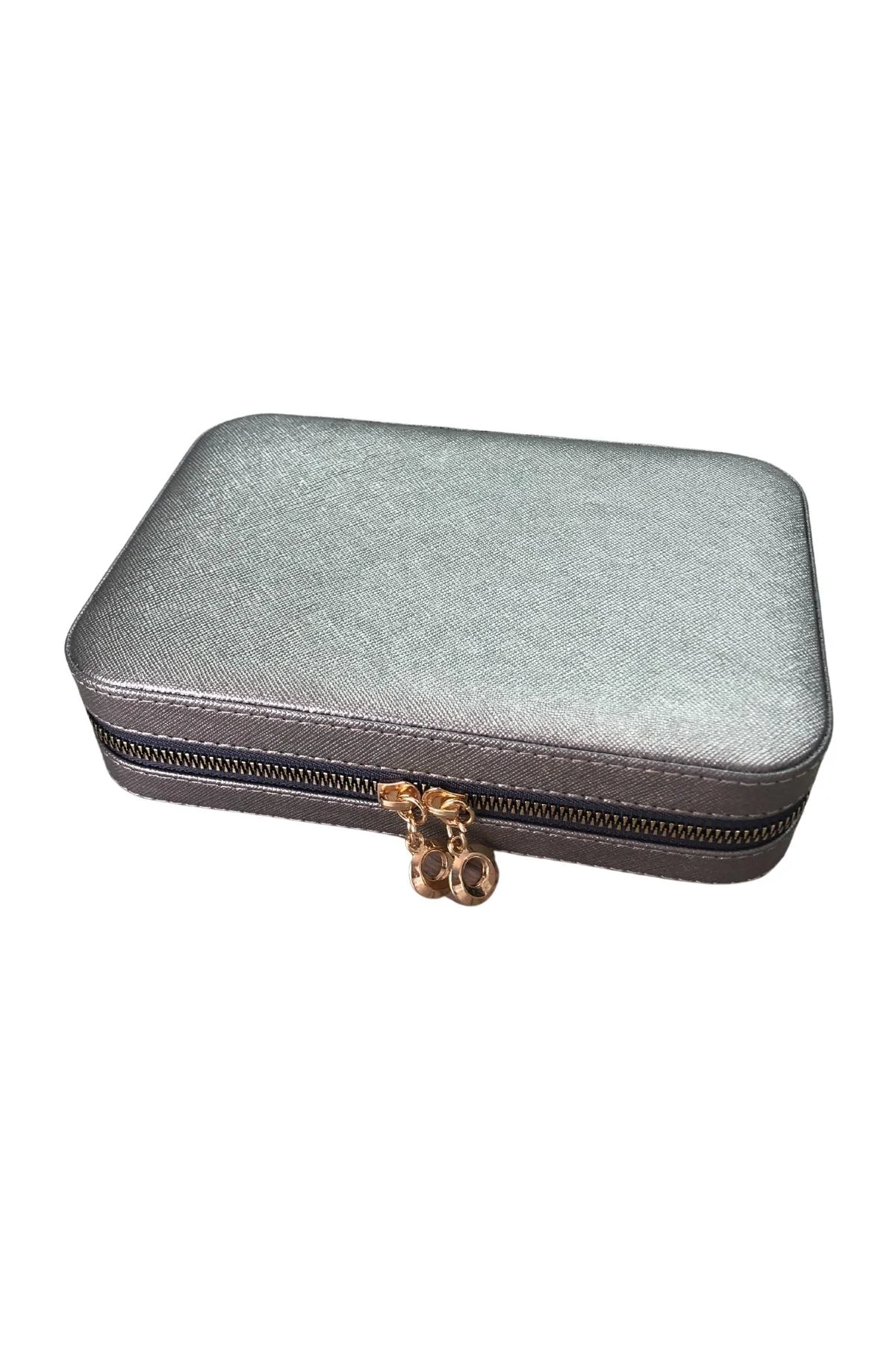 Fermuarlı Deri (ahşap Kasalı ) Büyük Boy Takı, Seyahat Ve Mücevher Çantası,Sılver 14x21 Cm)