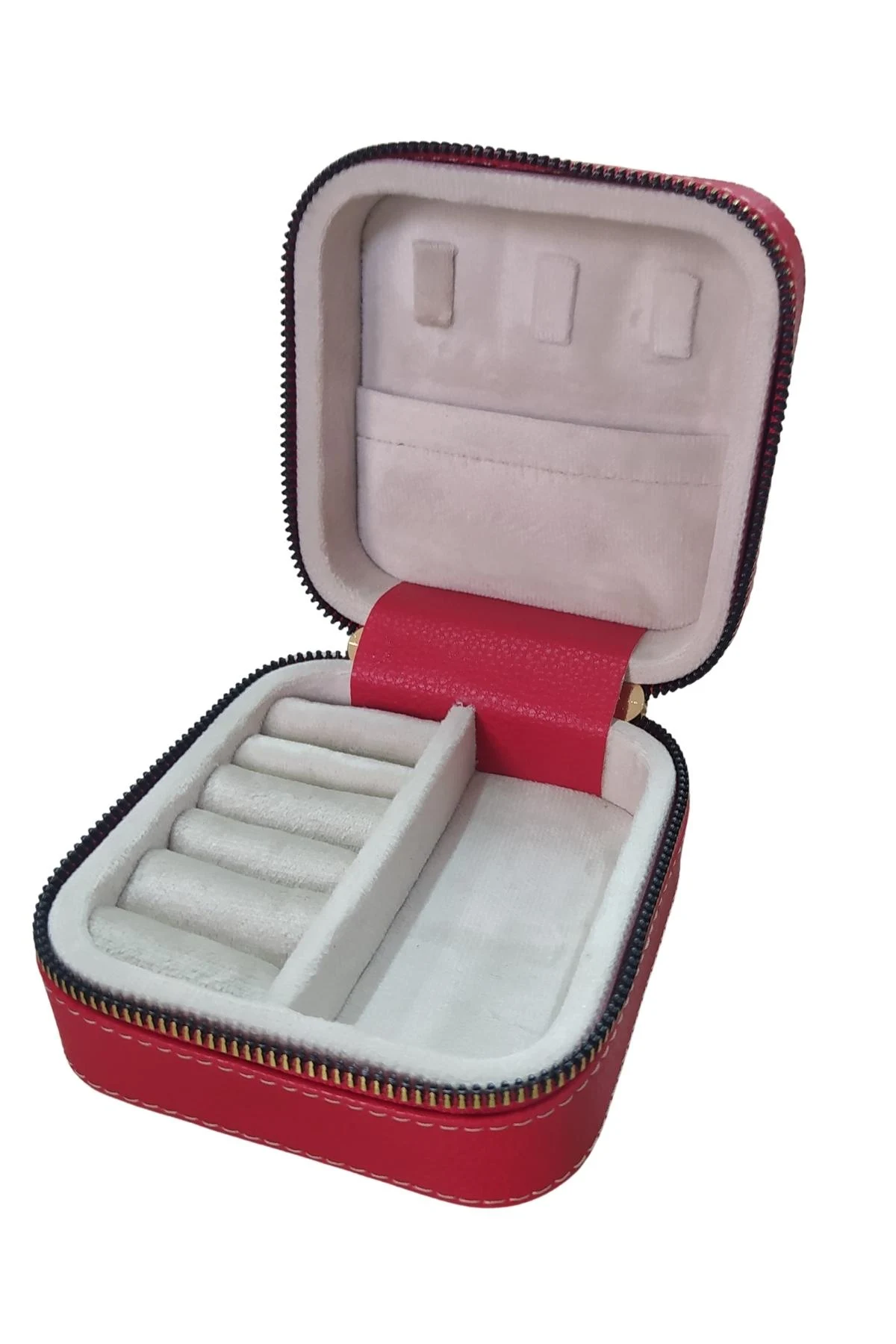 Fermuarlı Deri (Ahşap Kasalı ) Takı, Seyahat Ve Mücevher Çantası,kutusu Kırmızı (11x11 Cm )