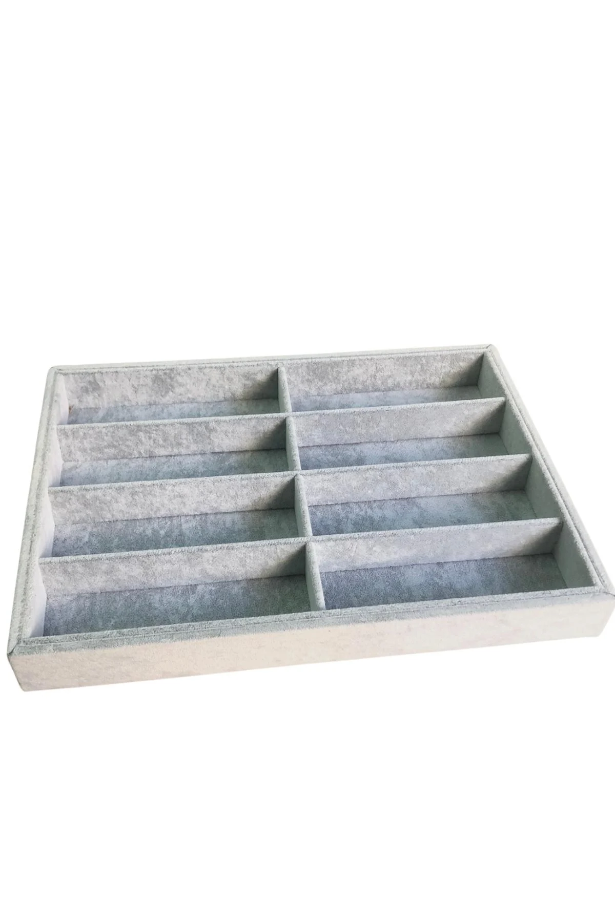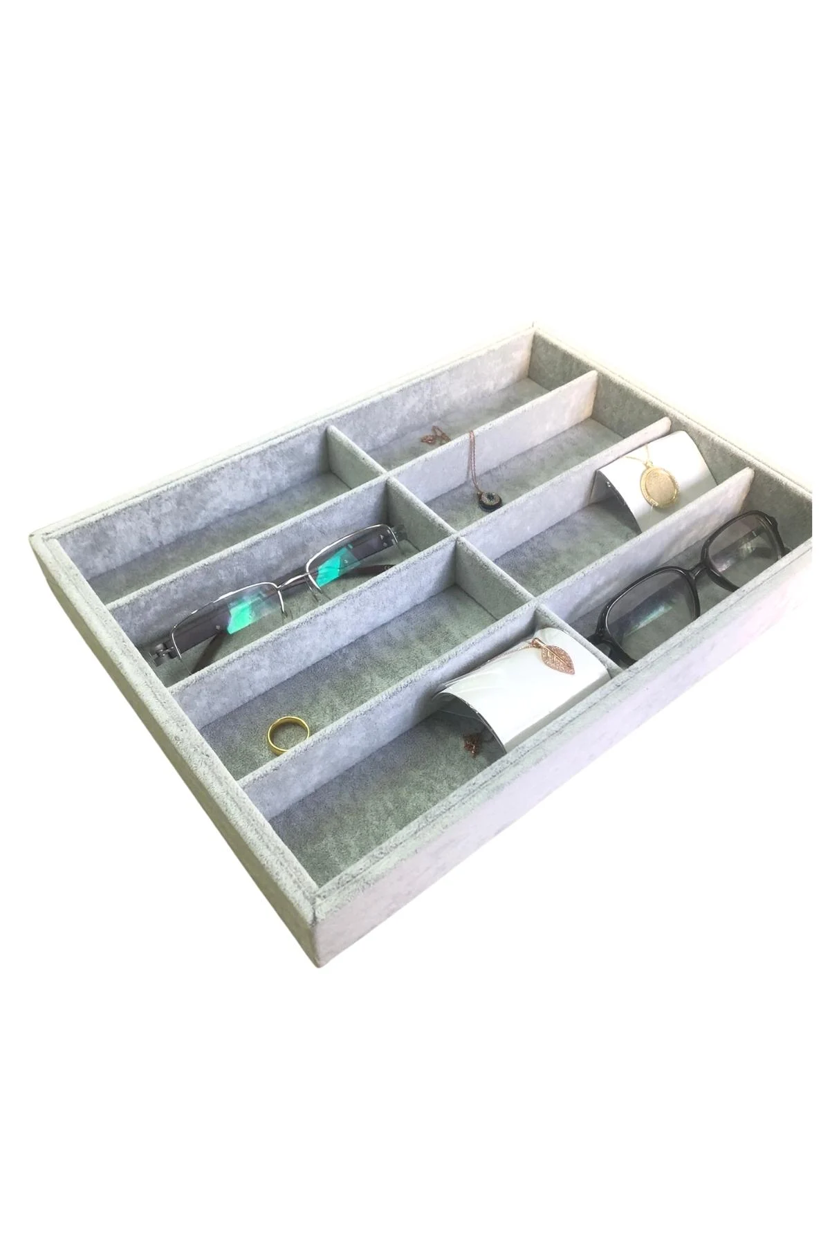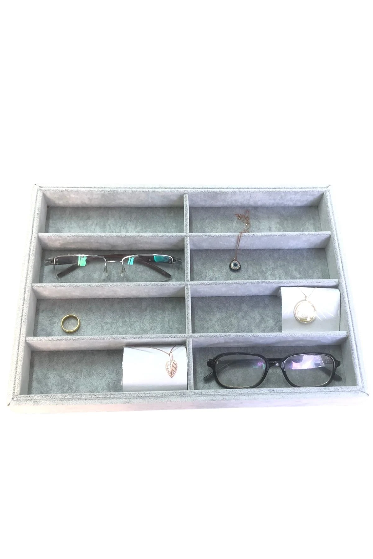 Gözlük Kolye Ucu Küpe Yüzük Servis Tablası Gri Süet (8 bölmeli) 25x35 cm