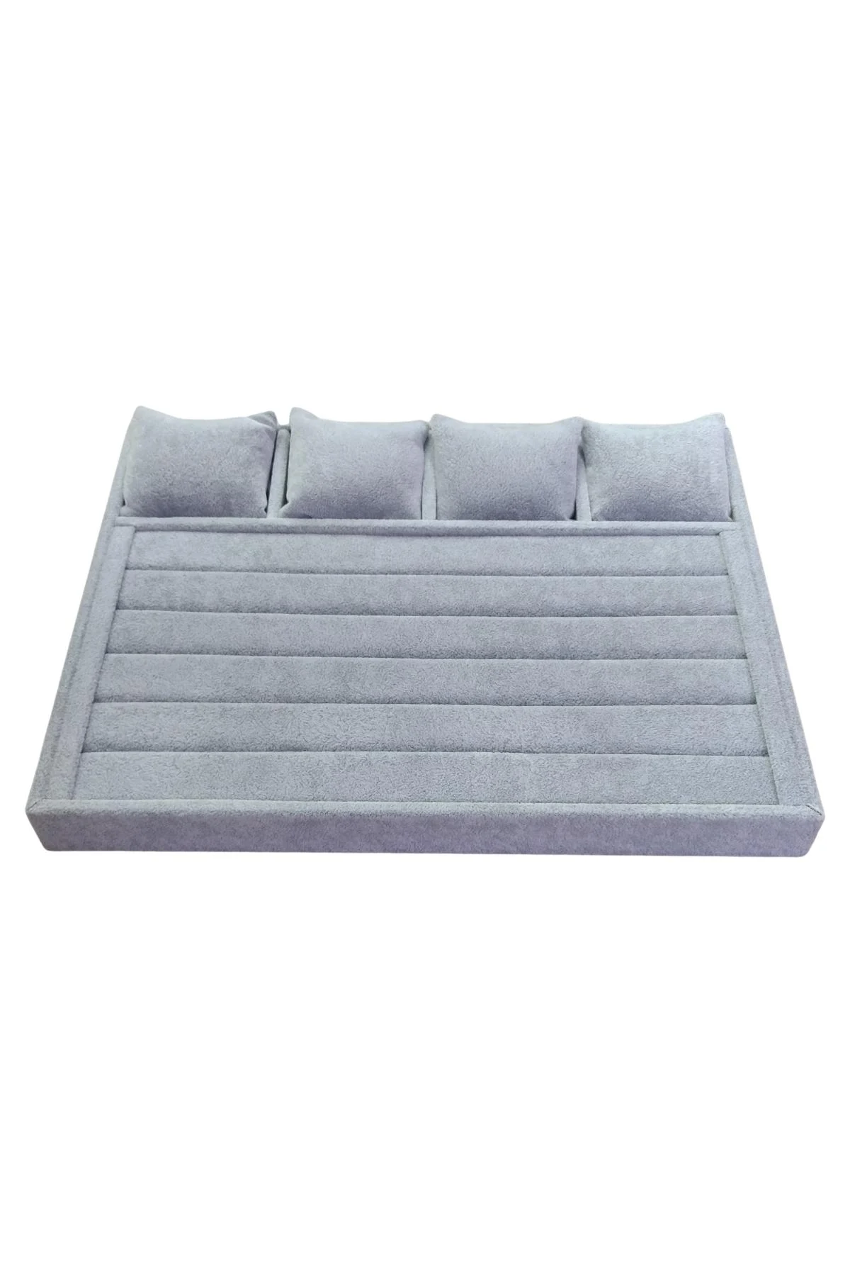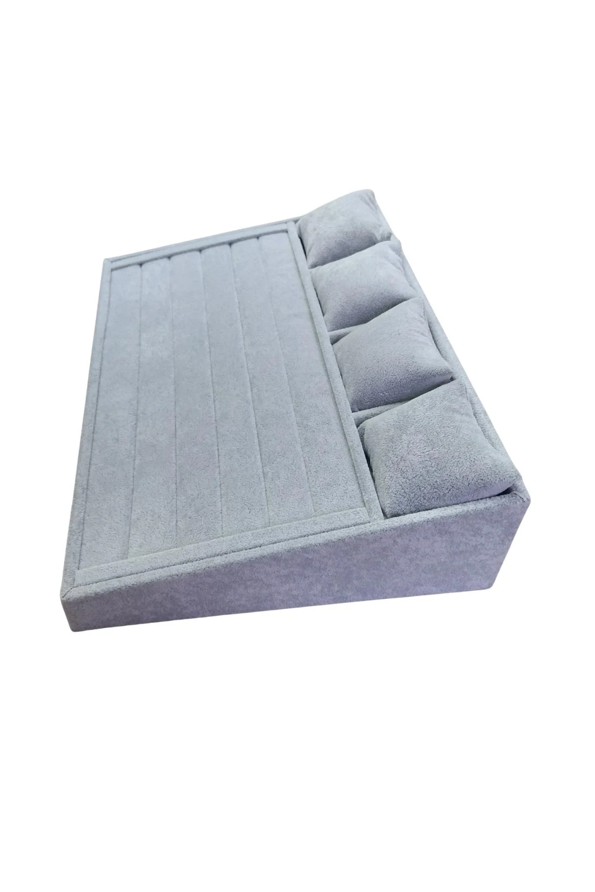 Saatlerinizi bilekliklerinizi ve yüzük leriniz şık bir şekilde sergileyebilirsiniz .ürün süet kumaş kaplamadır. Ebatları 25x35 cm dir . yükseklik 3 cm başlayıp 9cm de son bulmaktadır