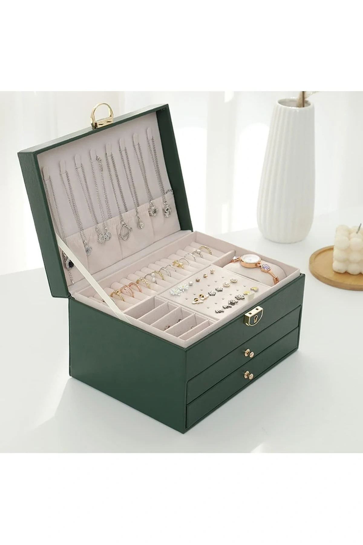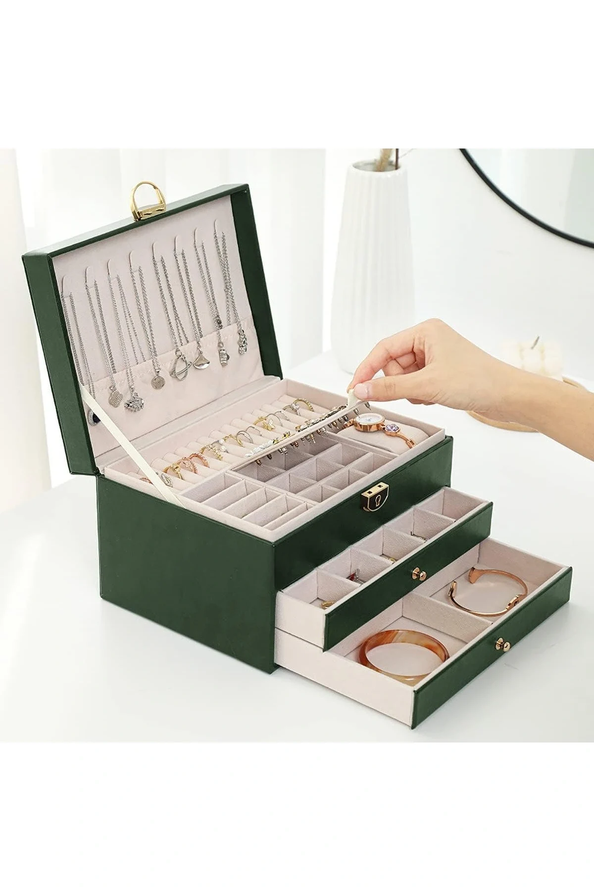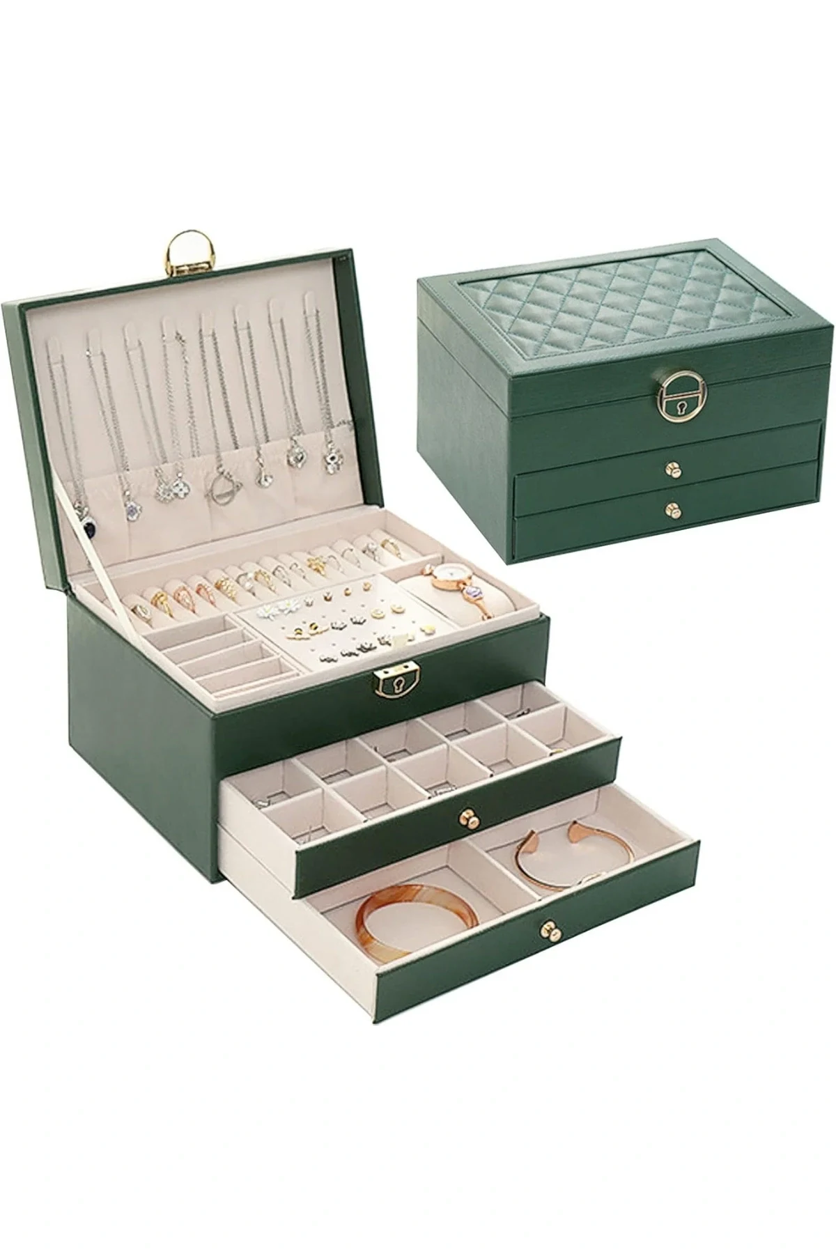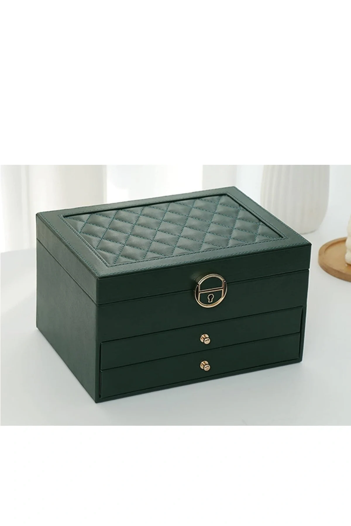 Lüks Anahtarlı Kapitoneli Deri Büyük Boy Takı, Seyahat Ve Mücevher Çantası,kutusu Yeşil(17x23 Cm )