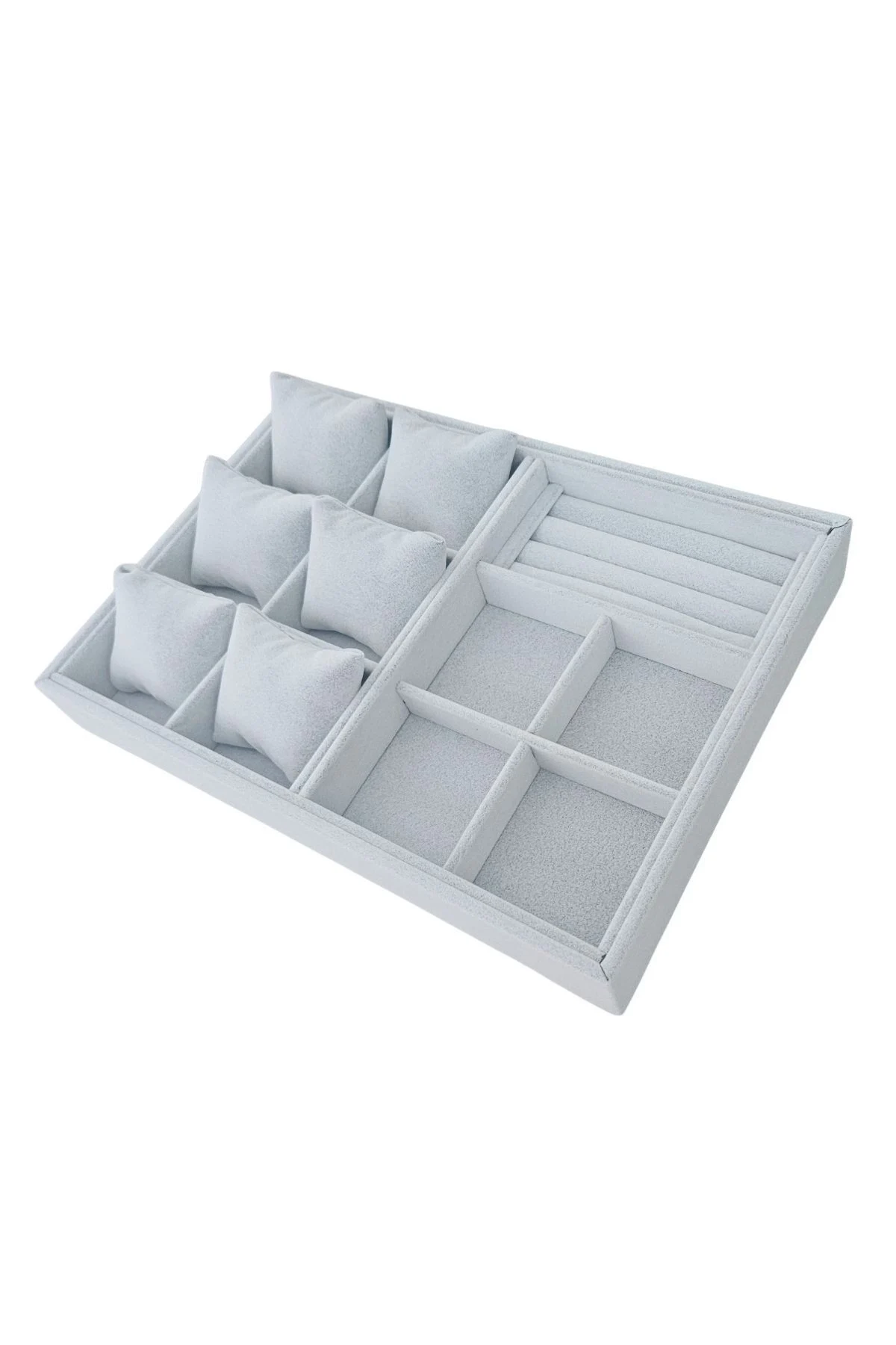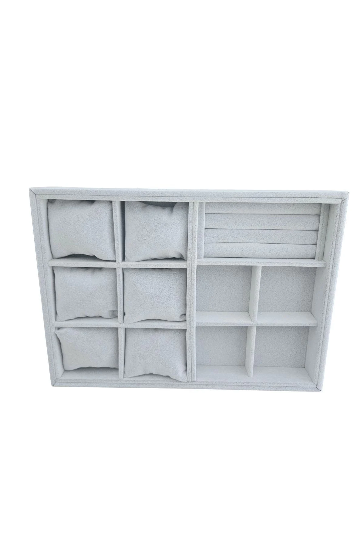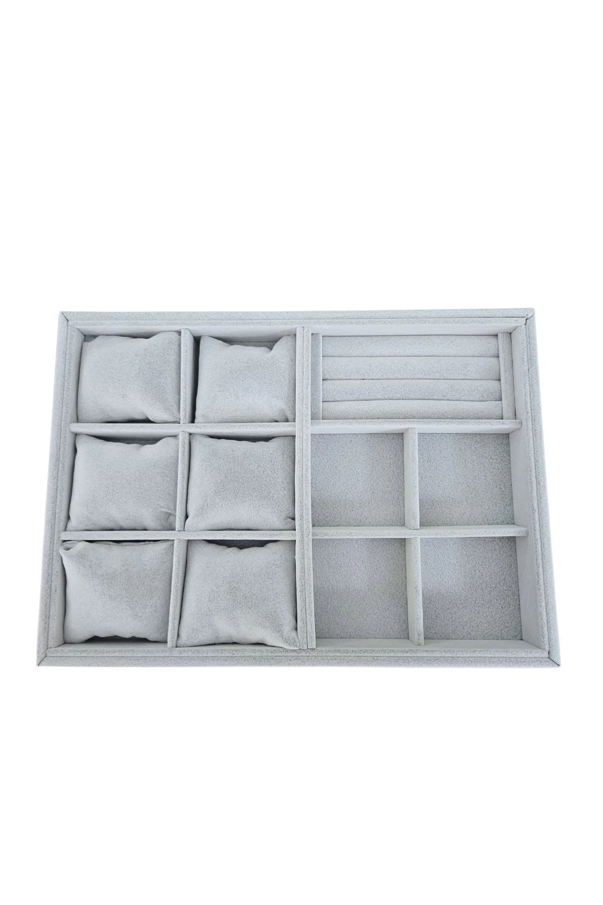 Organizatör Gri Süet Tabla Kolye & Yüzük Düzenleyici Ve Gözlük(8 Yastık)(6 Gözlük & 6 Bölmeli)36x38
