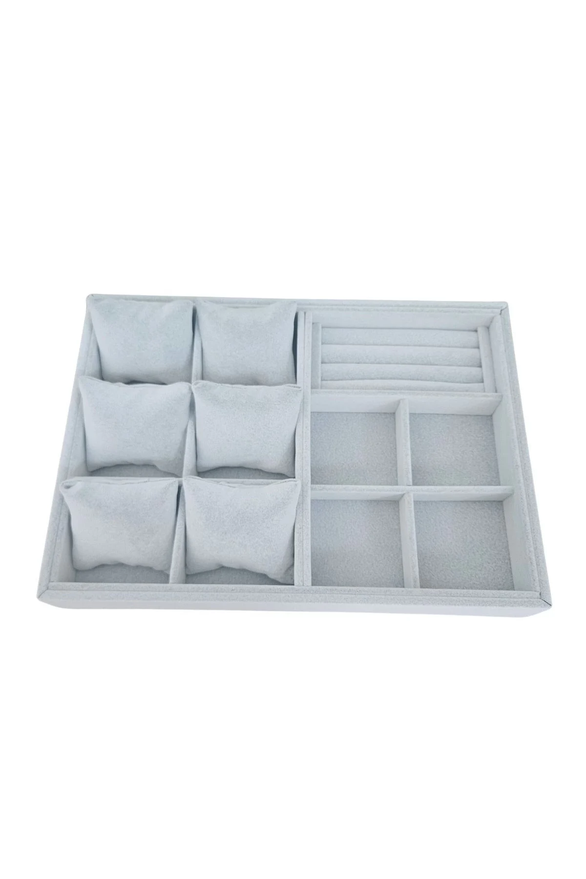 Organizatör Özer3 Gri Süet Tabla Kolye & Yüzük Düzenleyici Ve Gözlük(6 Yastık)(4 Bölmeli)(rulo)