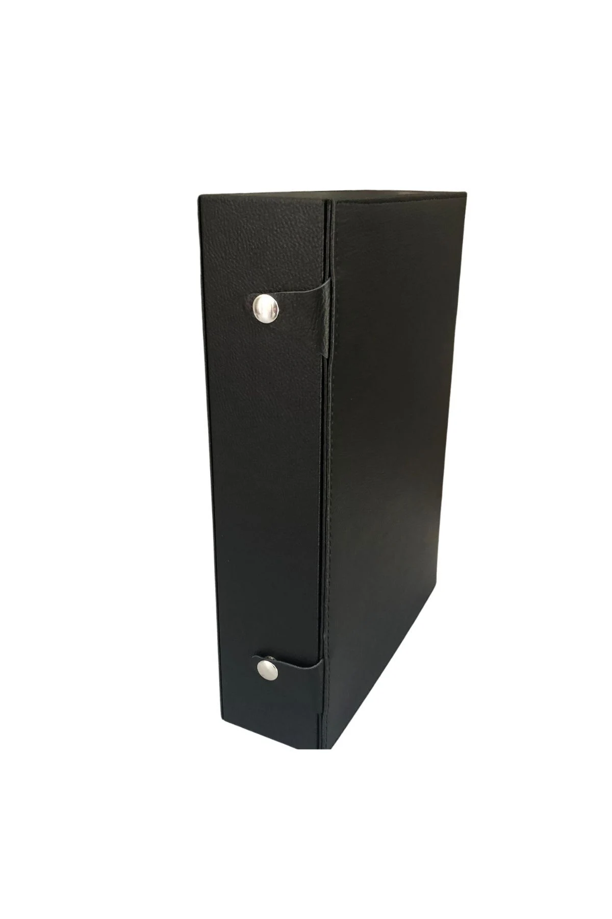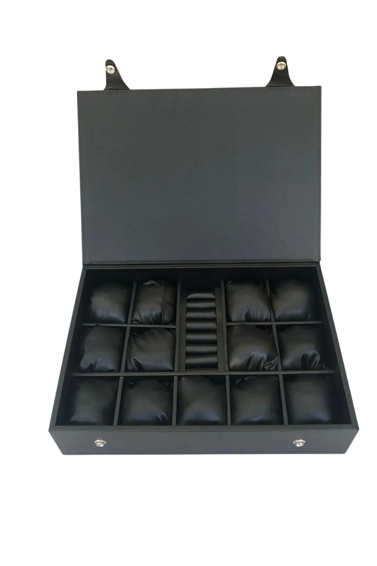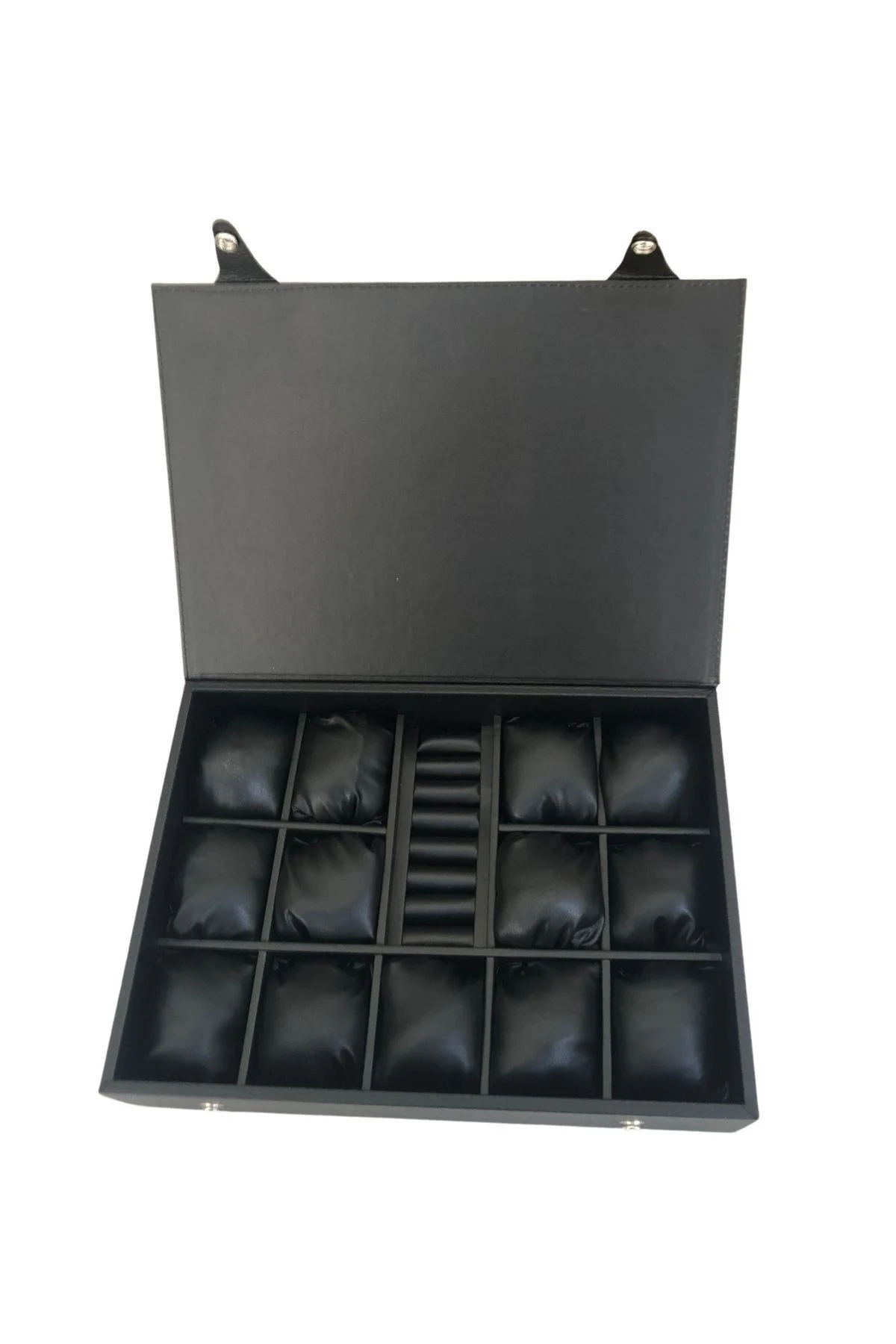 Saat Çantası 13 Lİ ve Yüzük rulo,Çıtçıtlı Ahşap Kasa Üzeri Siyah Deri Kaplama 25x35 cm İçi Siyah