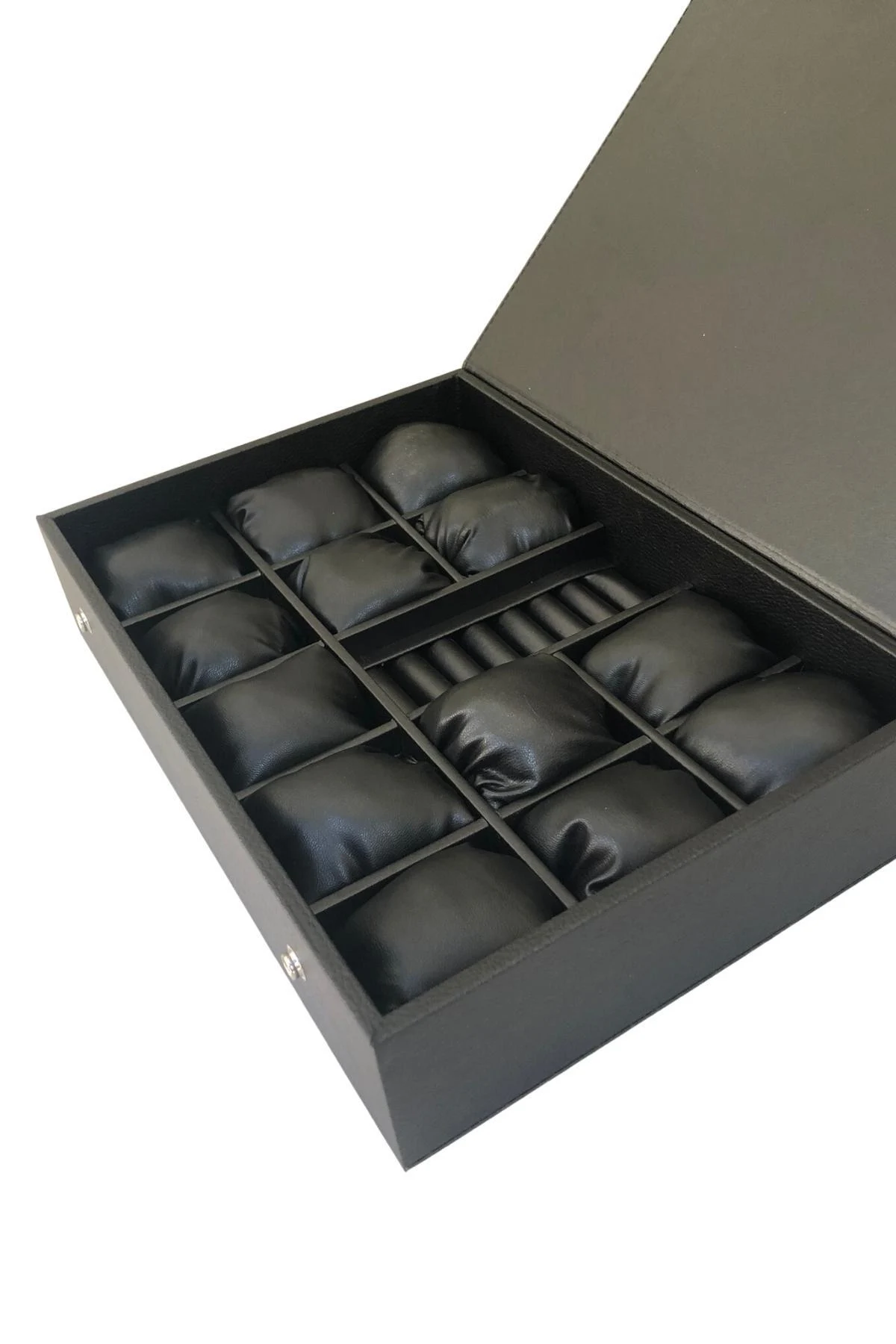 Saat Çantası 15 Lİ Çıtçıtlı Ahşap Kasa Üzeri Siyah Deri Kaplama 25x35 cm İçi BEYAZ